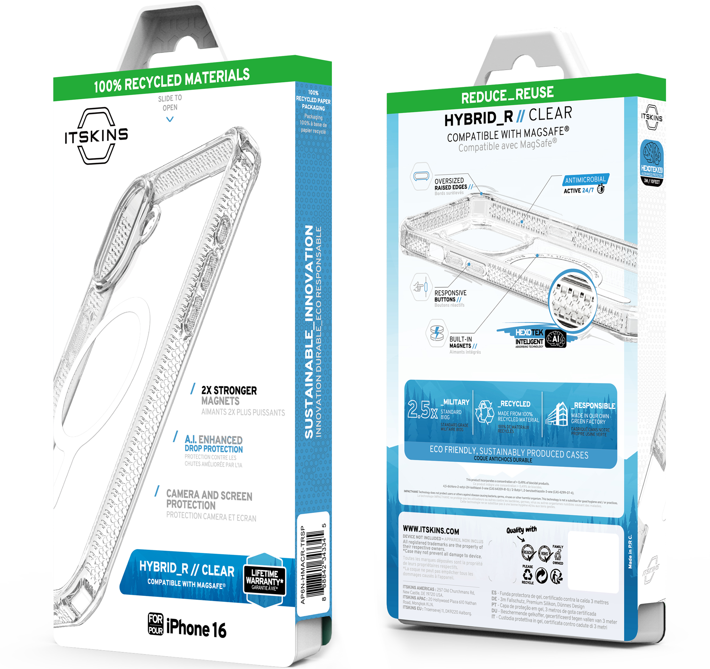 HYBRID_R CLEAR : Crafted for the Active, it features a never-yellowing, crystal-clear rigid polycarbonate back that showcases your phone's beautiful finish, 2X Stronger MagSafe and AI-Enhanced 3M / 10ft Drop Defense. It is Global Recycled Standard Certified, with an Eco-Friendly design incorporating Air-Pocket Corners, Antimicrobial Features, and Responsive Buttons. Comes with a Lifetime Warranty for Endless Adventures.