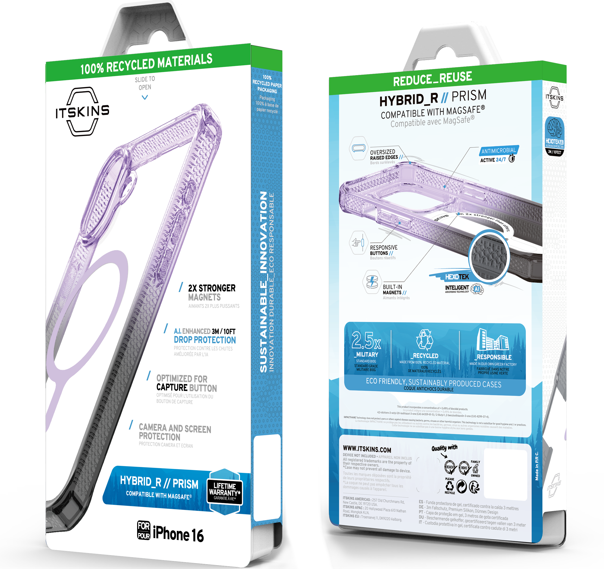 HYBRID_R PRISM : Designed for the Fashion-Forward Active Lifestyle, it Features a Stylish Two-Tone Bumper and a crystal-clear rigid polycarbonate back that showcases your phone's beautiful finish, 2X Stronger MagSafe and AI-Enhanced 3M / 10ft Drop Defense. Global Recycled Standard Certified, with an Eco-Friendly design incorporating Air-Pocket Corners, Antimicrobial Protection, and Responsive Buttons. Lifetime Warranty for the Stylish Adventurer.