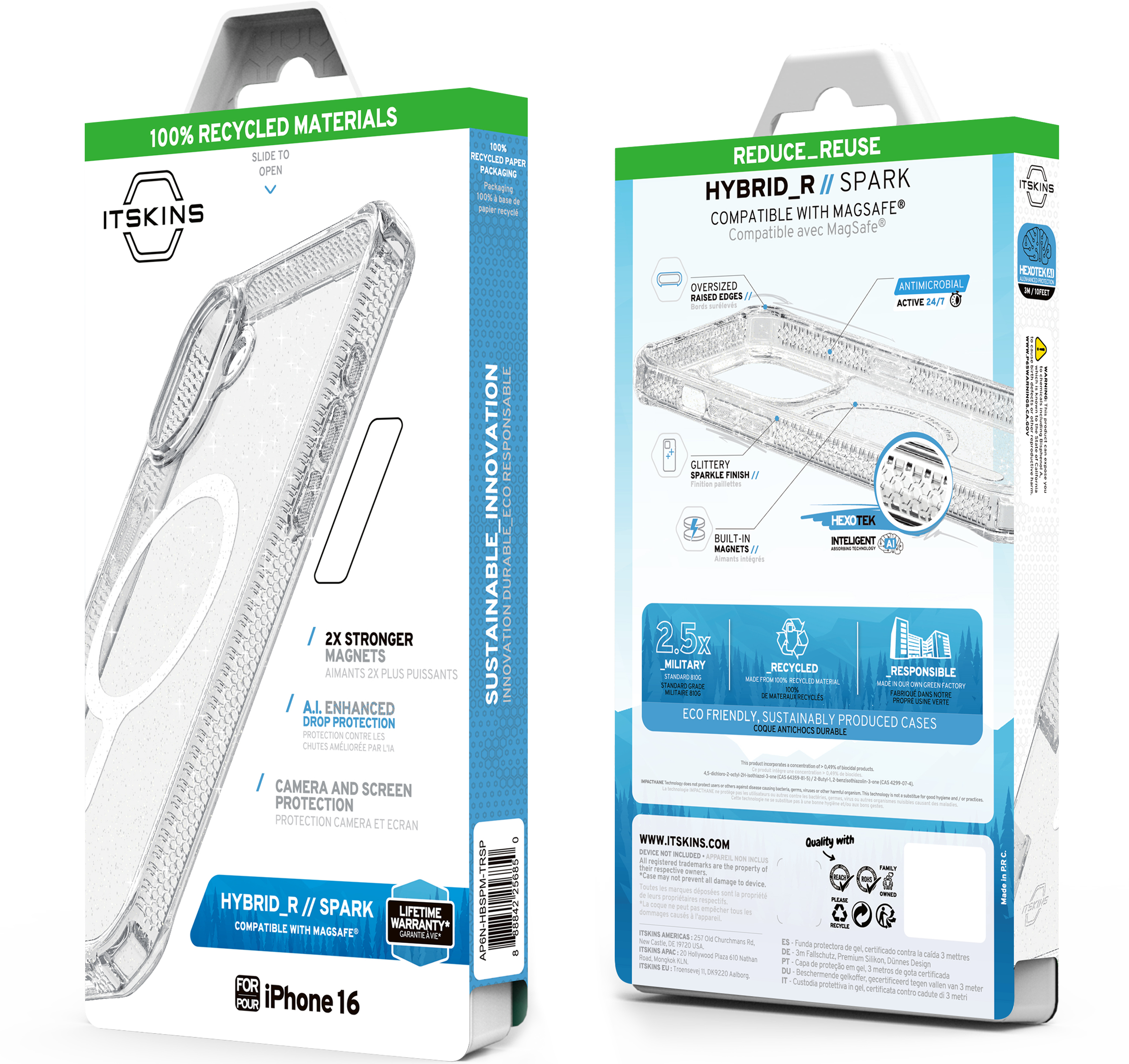 HYBRID R SPARK : glamorizes your iPhone with a fully glitter-infused case that highlights your phone's premium aesthetics. Its sparkling, anti-scratch design keeps it dazzling from every angle. Integrated with 2X Stronger MagSafe, AI-optimized for up to 3M / 10ft drop protection, and eco-friendly with Global Recycled Standard Certification. Comes with air-pocket corners for shock absorption, antimicrobial features, and responsive buttons, all with a Lifetime Warranty for the active, style-conscious individual.