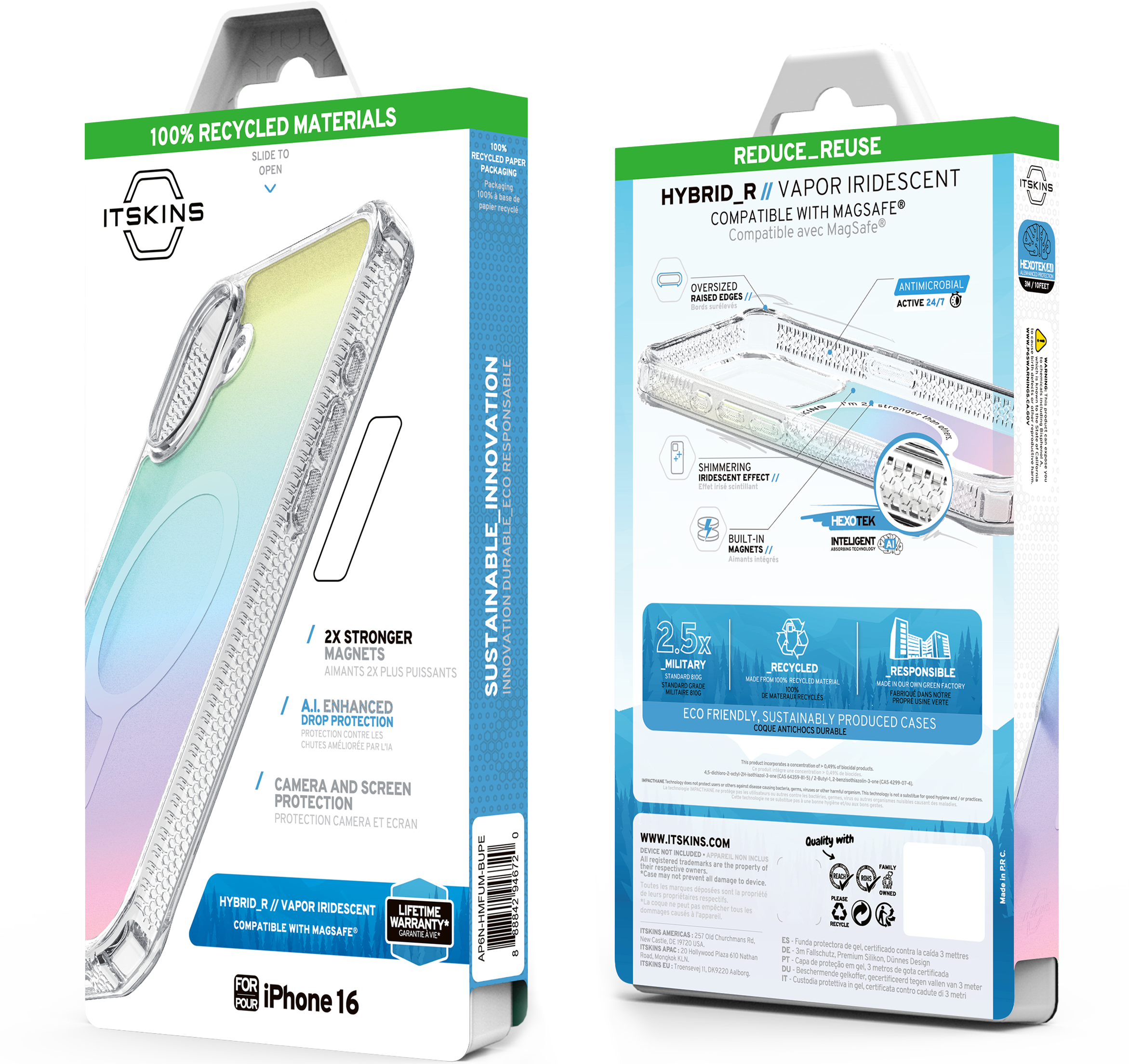 HYBRID R VAPOR IRIDESCENT : showcases a dreamy iridescent effect that shifts colors with movement., AI-enhanced for up to 3M / 10ft impact resistance, and is eco-conscious with Global Recycled Standard Certification. It includes air-pocket corners, antimicrobial properties, and tactile buttons, ensuring a Lifetime Warranty for the actively innovative, "think different" individual.