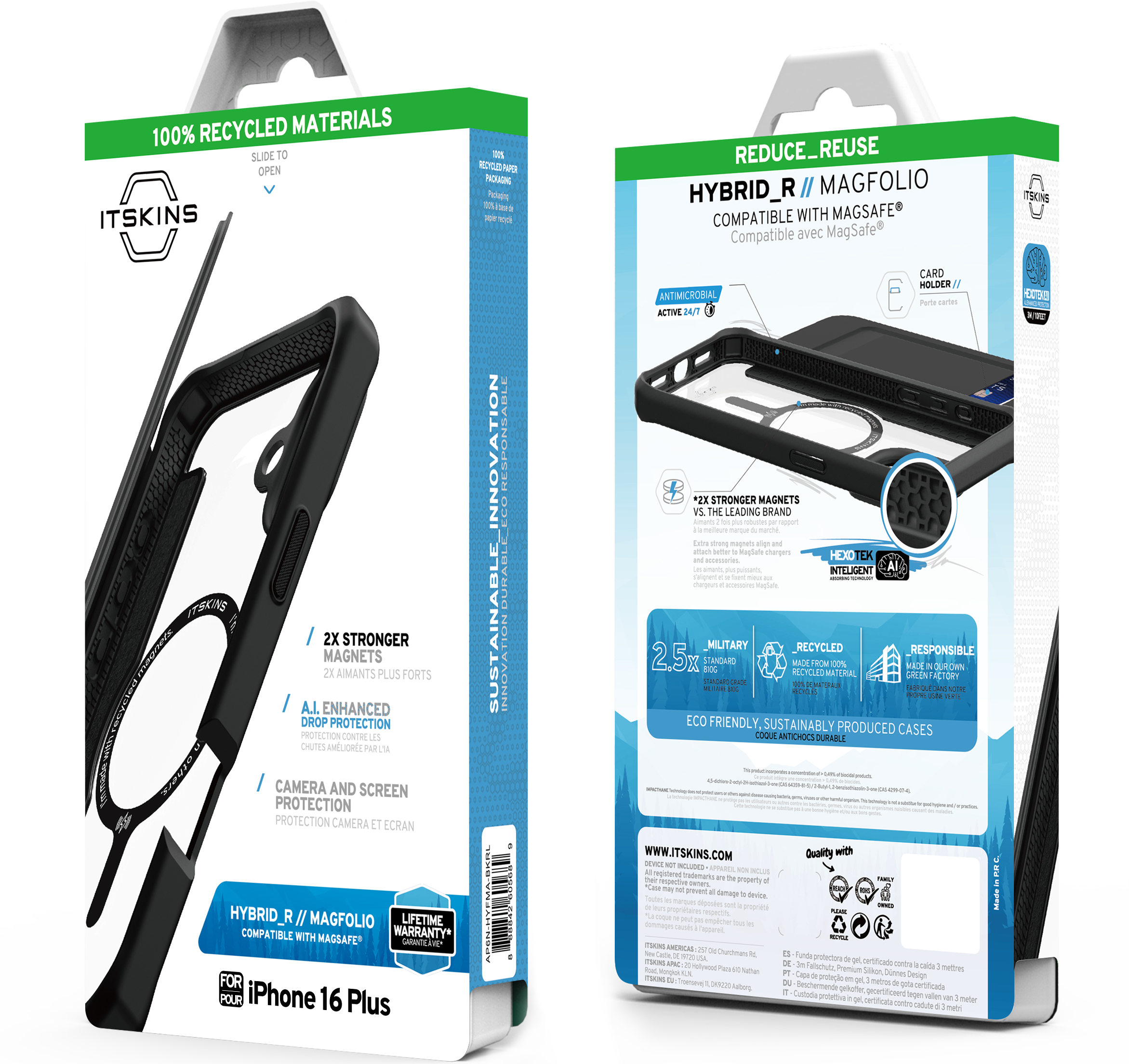 HYBRID_R FOLIO : Offers complete 360 protection for your device with its folio design, which can also hold credit cards or a driver's license and function as a stand. Features a textured solid bumper for enhanced grip, a never-yellowing, crystal clear rigid polycarbonate back that showcases the beautiful finish of your phone, melded with 2x stronger MagSafe and AI-enhanced 3M / 10ft drop defense. Eco-conscious with Global Recycled Standard certification, includes air-pocket corners, antimicrobial protection, and tactile buttons—Adventure-ready with a lifetime warranty.