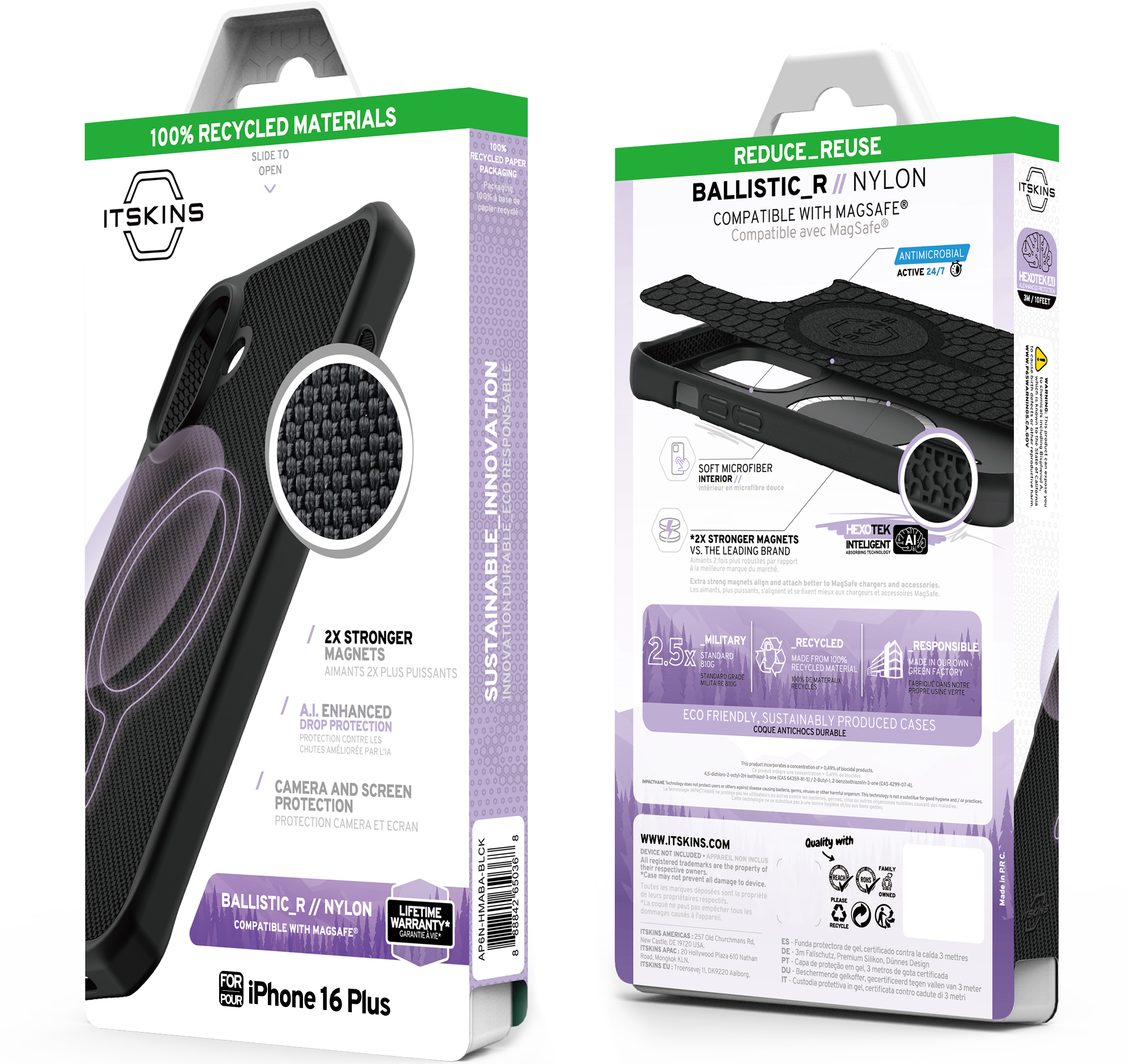 HYBRID_R NYLON : Combines a ballistic nylon weave back for rugged style and durability with a textured solid bumper for enhanced grip. It boasts a 2X Stronger MagSafe for secure attachment, is AI-enhanced to withstand drops up to 3m / 10ft, and is eco-friendly with Global Recycled Standard Certification. Includes features like air-pocket corners, antimicrobial protection, and responsive buttons, making it perfect for an active lifestyle, all supported by a lifetime warranty.