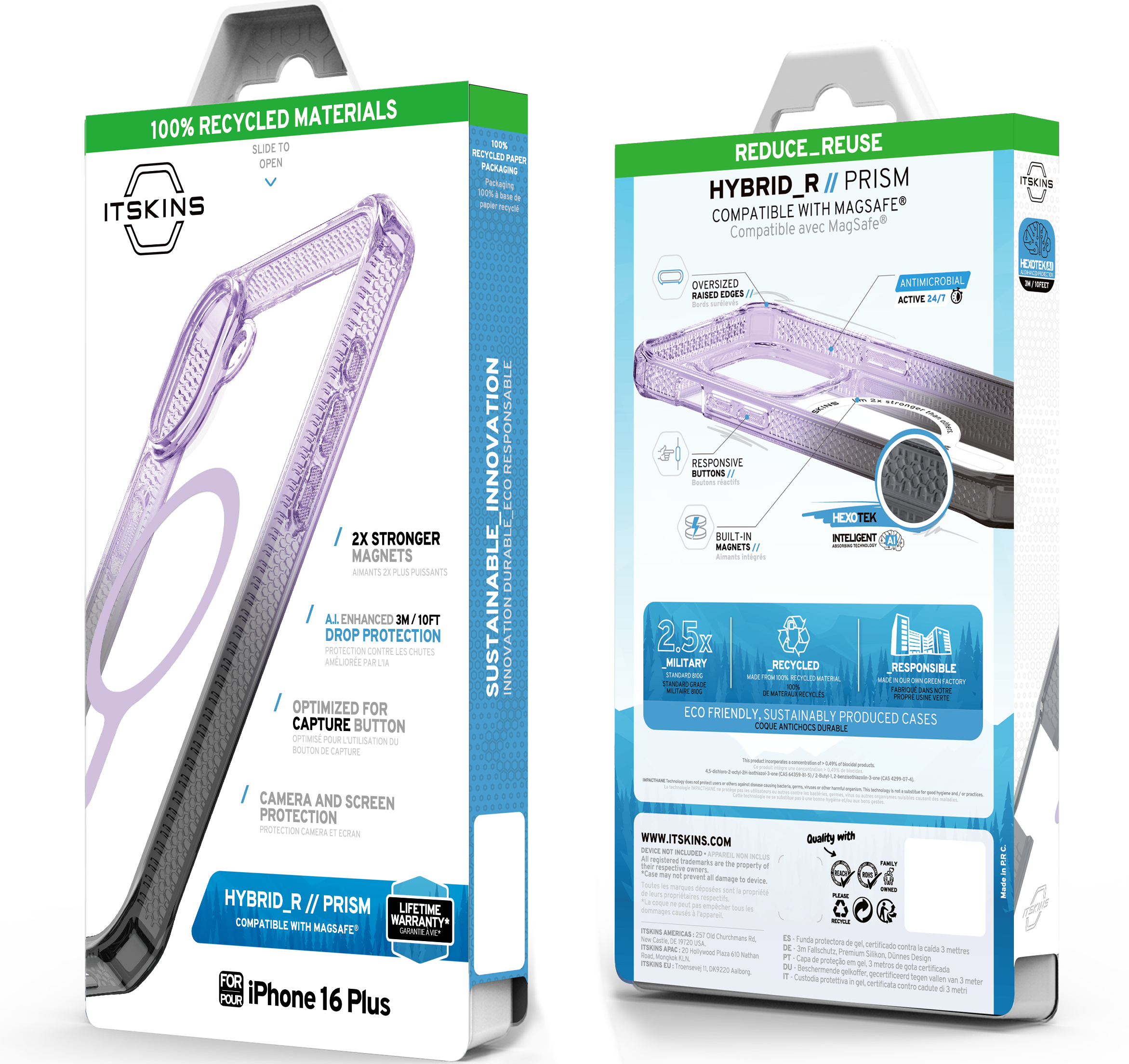 HYBRID_R PRISM : Designed for the Fashion-Forward Active Lifestyle, it Features a Stylish Two-Tone Bumper and a crystal-clear rigid polycarbonate back that showcases your phone's beautiful finish, 2X Stronger MagSafe and AI-Enhanced 3M / 10ft Drop Defense. Global Recycled Standard Certified, with an Eco-Friendly design incorporating Air-Pocket Corners, Antimicrobial Protection, and Responsive Buttons. Lifetime Warranty for the Stylish Adventurer.