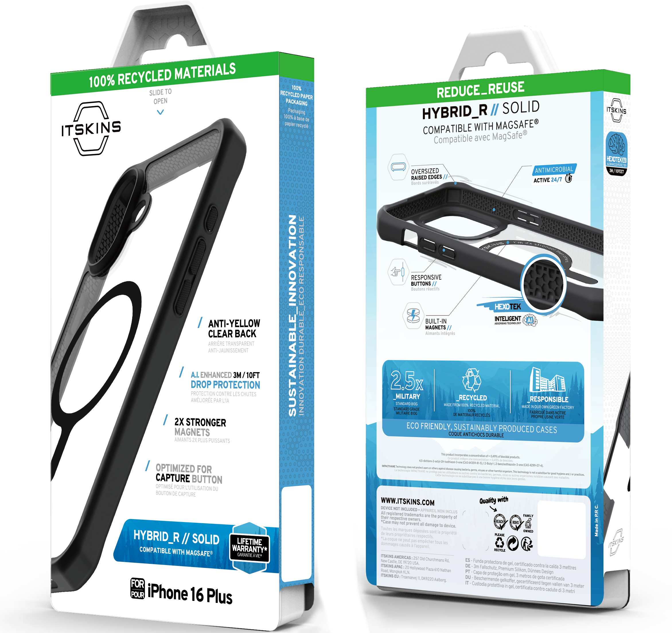 HYBRID_R SOLID : features a textured solid bumper for enhanced grip, a never-yellowing, crystal clear rigid polycarbonate back that showcases the beautiful finish of your phone, melded with 2x stronger MagSafe and AI-enhanced 3M / 10ft drop defense. Eco-conscious with Global Recycled Standard certification, air-pocket corners, antimicrobial protection, and tactile buttons. Adventure-ready with a lifetime warranty.