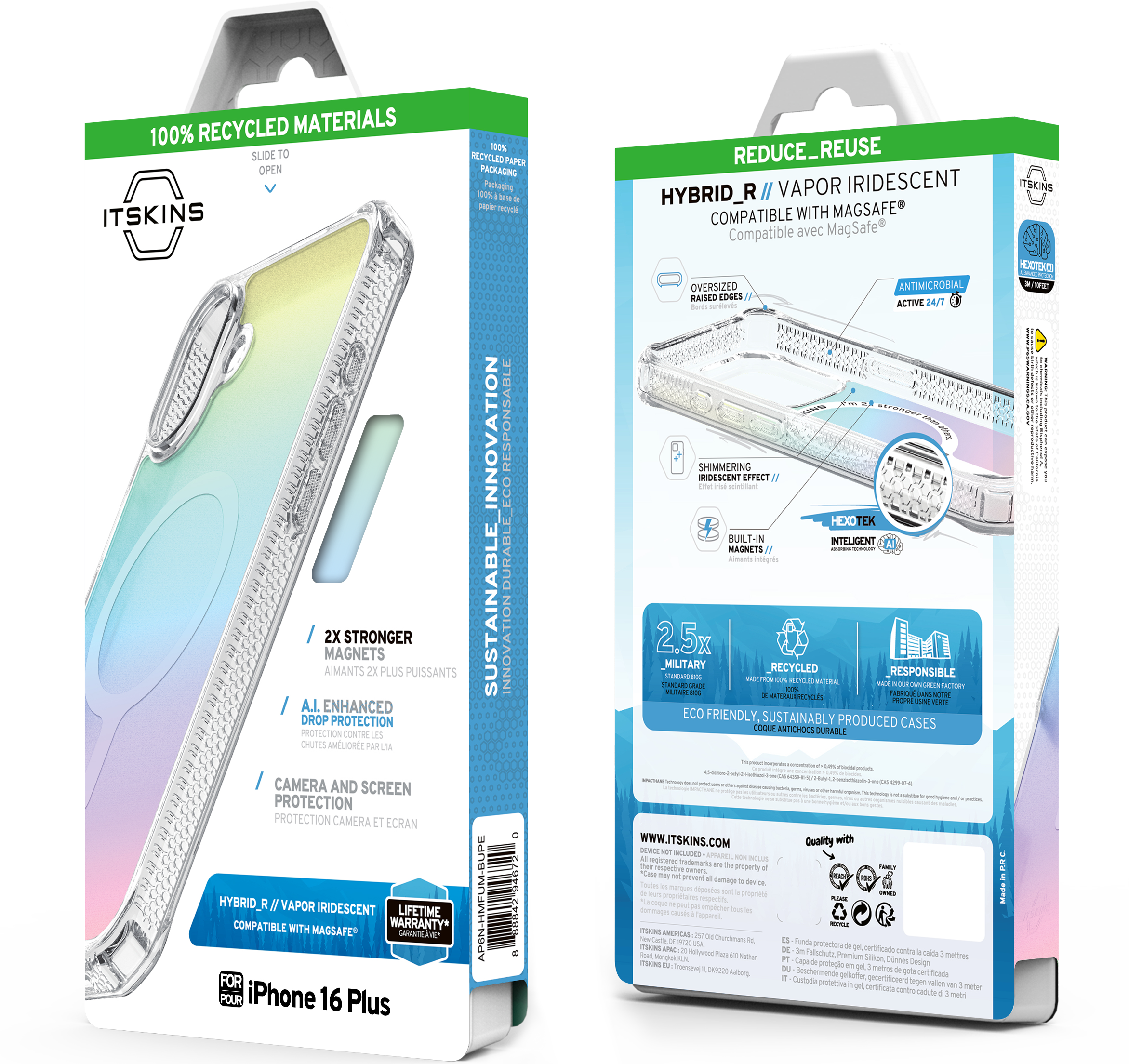 HYBRID R VAPOR IRIDESCENT : showcases a dreamy iridescent effect that shifts colors with movement., AI-enhanced for up to 3M / 10ft impact resistance, and is eco-conscious with Global Recycled Standard Certification. It includes air-pocket corners, antimicrobial properties, and tactile buttons, ensuring a Lifetime Warranty for the actively innovative, "think different" individual.