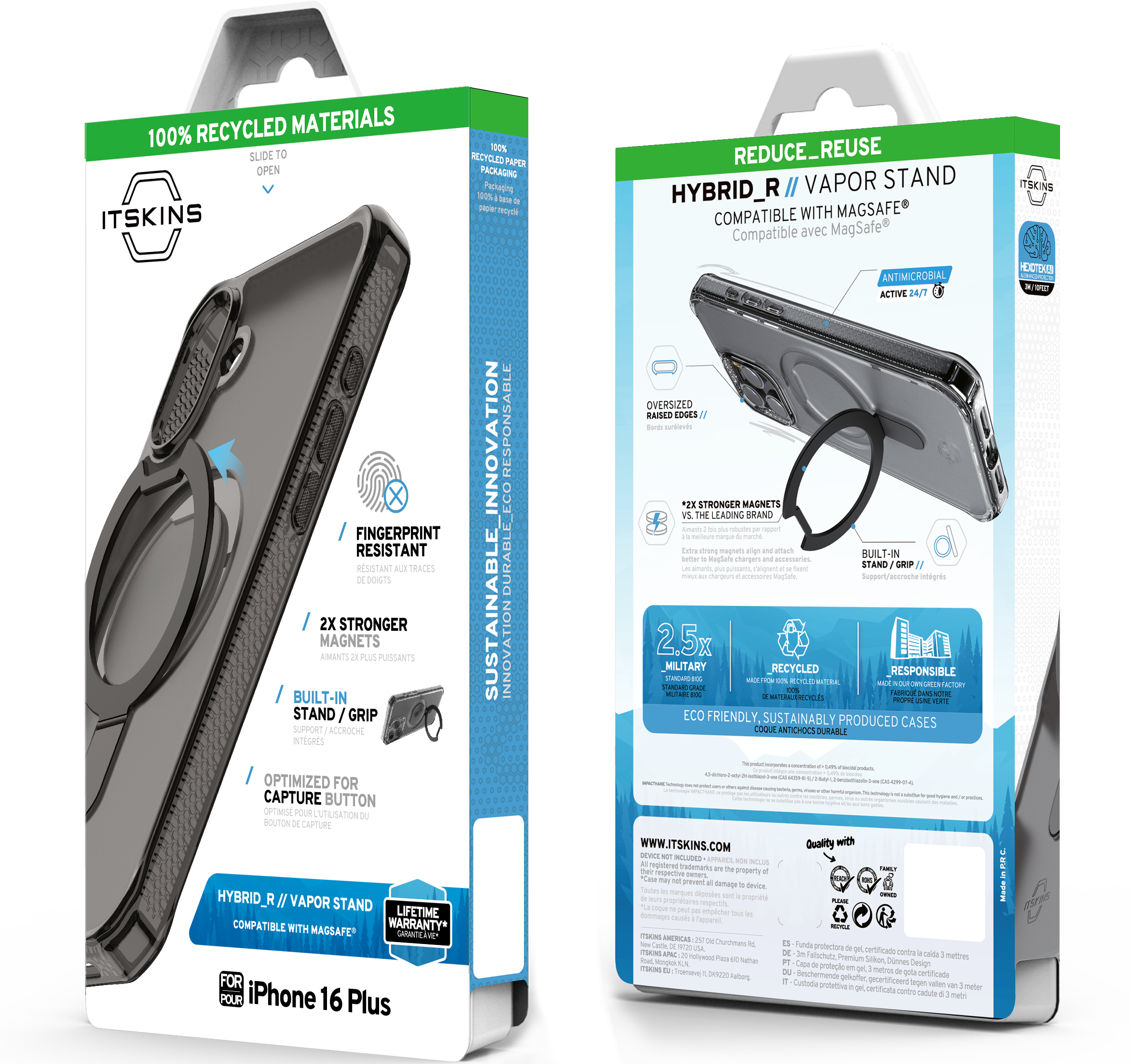 HYBRID R VAPOR STAND : comes packed with features, like a versatile built-in magnetic ring acting as a stand or holder, and is MagSafe-compatible. Designed to sit flush for ease of pocket use. Showcases a matte frosted hardback with a glossy clear bumper, accentuating your phone's titanium trim. Offers AI-enhanced drop protection up to 3M / 10ft, is eco-friendly with Global Recycled Standard Certification, and includes air-pocket corners, antimicrobial protection, and responsive buttons. Geared for the active lifestyle with a Lifetime Warranty.