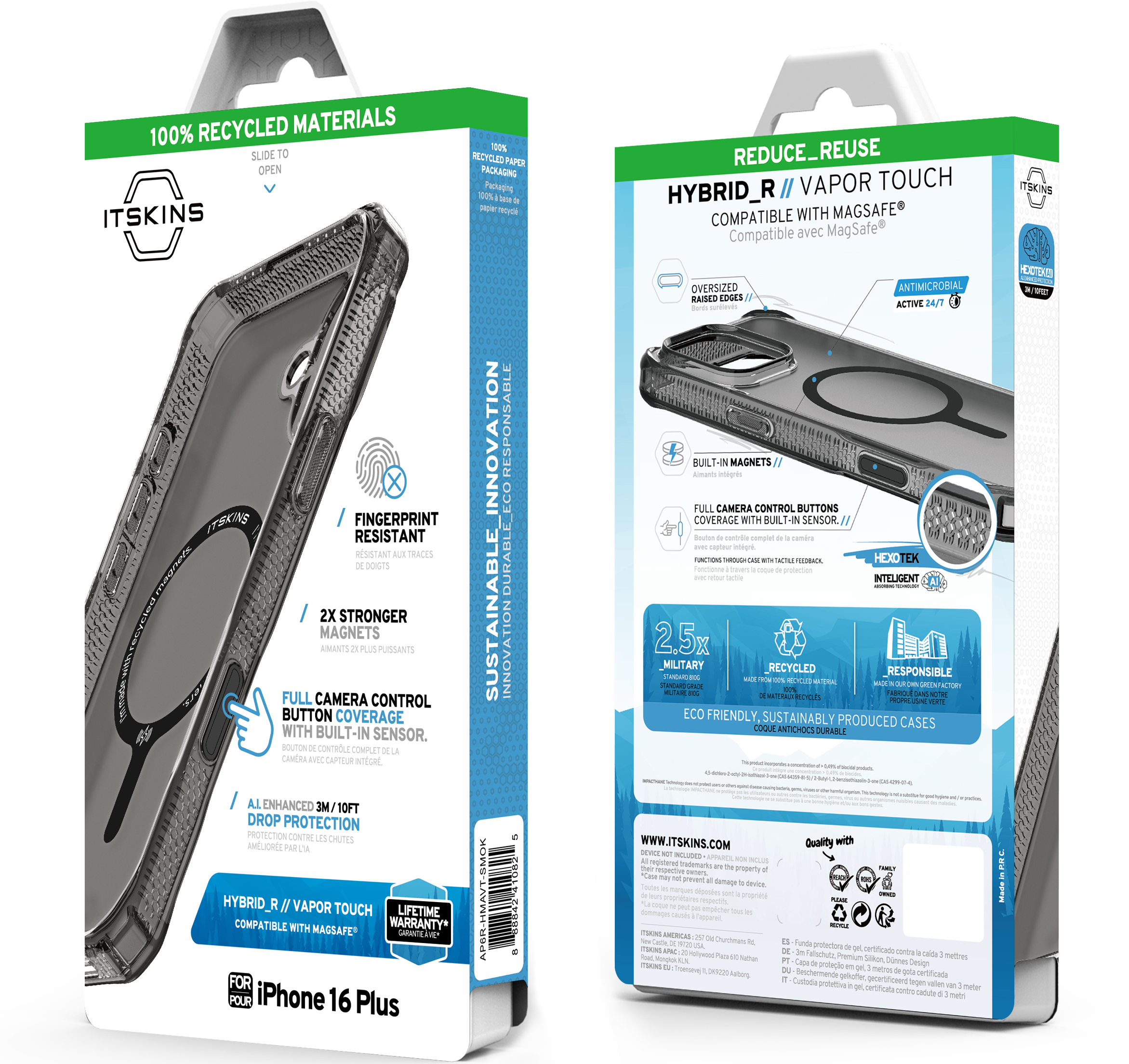 HYBRID R // VAPOR TOUCH now features a protective touch button designed to enhance interaction with your iPhone's Control button without sacrificing sensitivity. Combines a sleek, matte frosted hardback with a glossy clear bumper, showcasing your phone's titanium trim. Its fingerprint-resistant, anti-scratch back surface maintains beauty over time. It is integrated with 2X Stronger MagSafe for secure attachment, AI-optimized for up to 3M / 10ft drop protection, and eco-friendly with Global Recycled Standard Certification. Equipped with air-pocket corners, antimicrobial defense, and responsive buttons, it's prepared for any adventure with a Lifetime Warranty.