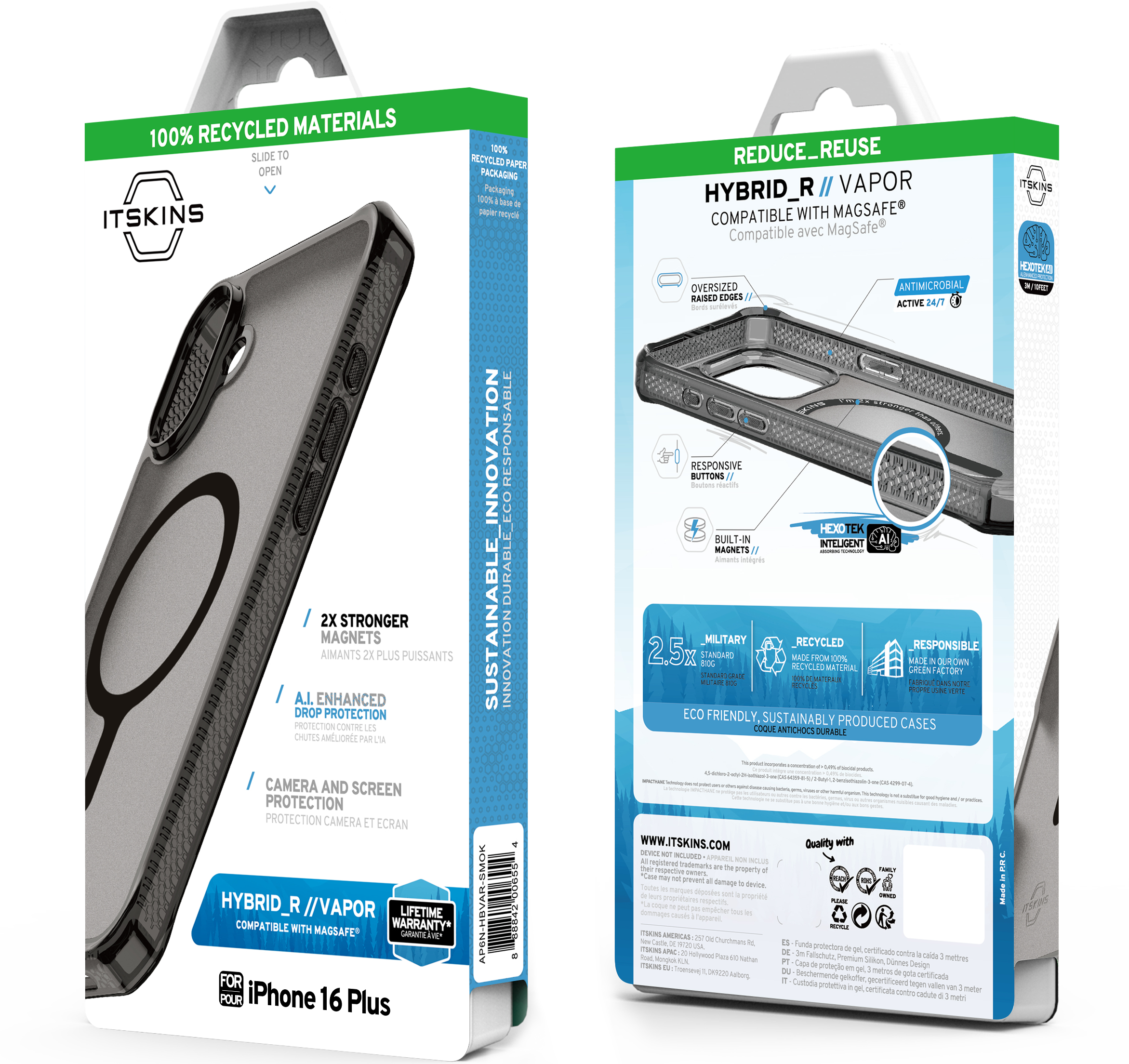 HYBRID R VAPOR : combines a sleek, matte frosted hardback with a glossy clear bumper, showcasing your phone's titanium trim. Its fingerprint-resistant, anti-scratch back surface maintains beauty over time. It is integrated with 2X Stronger MagSafe for secure attachment, AI-optimized for up to 3M / 10ft drop protection, and eco-friendly with Global Recycled Standard Certification. Equipped with air-pocket corners, antimicrobial defense, and responsive buttons, it's prepared for any adventure with a Lifetime Warranty.