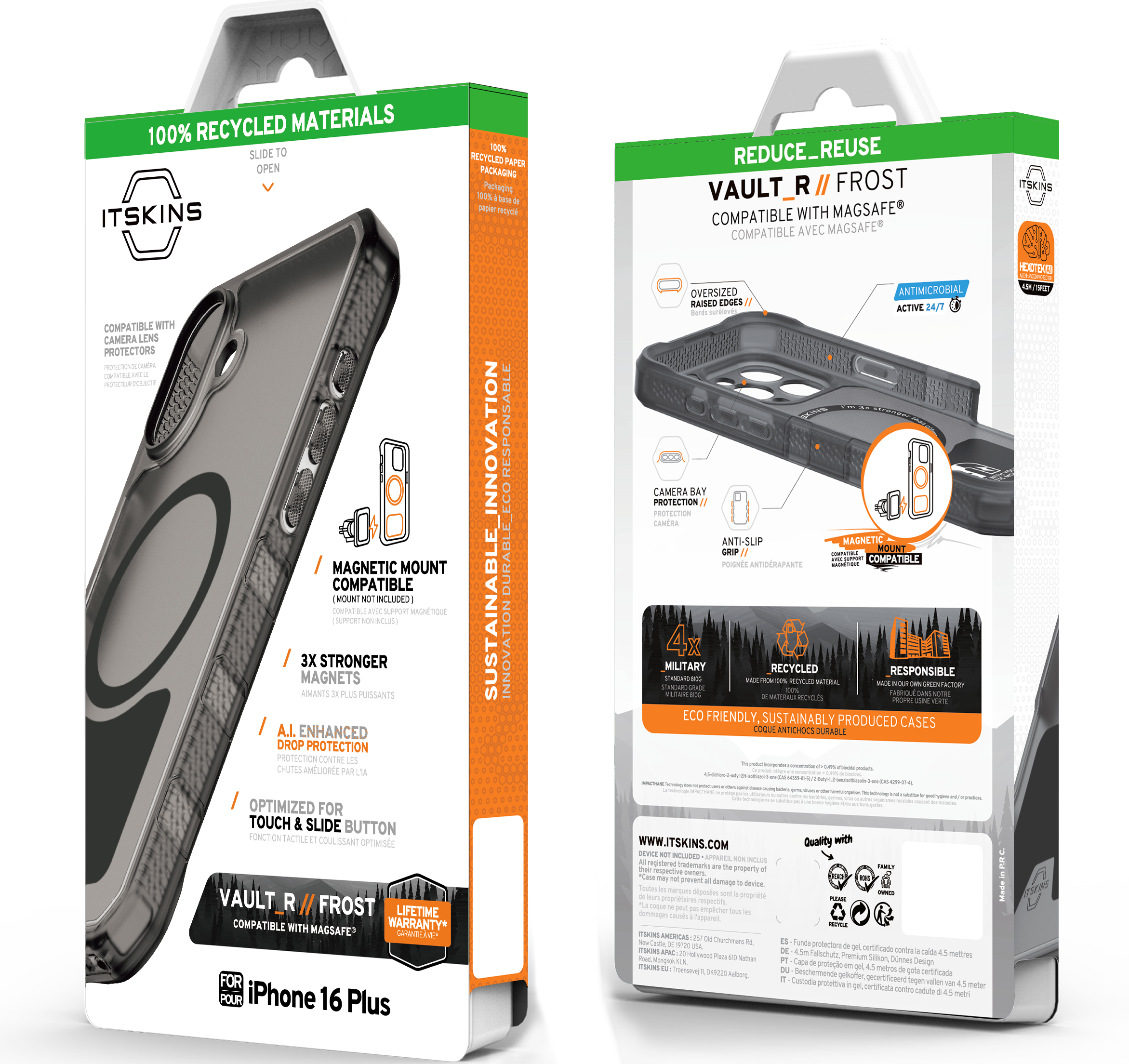 SUPREME R // FROST :  is our most protective case. Equipped with a Built-in Metal Plate compatible with car mounts for those needing a stronger attachment option than MagSafe provides. Enhanced with AI technology, it offers superior impact absorption around the interior perimeter, protecting your device from drops up to 4.5M / 15 Feet.