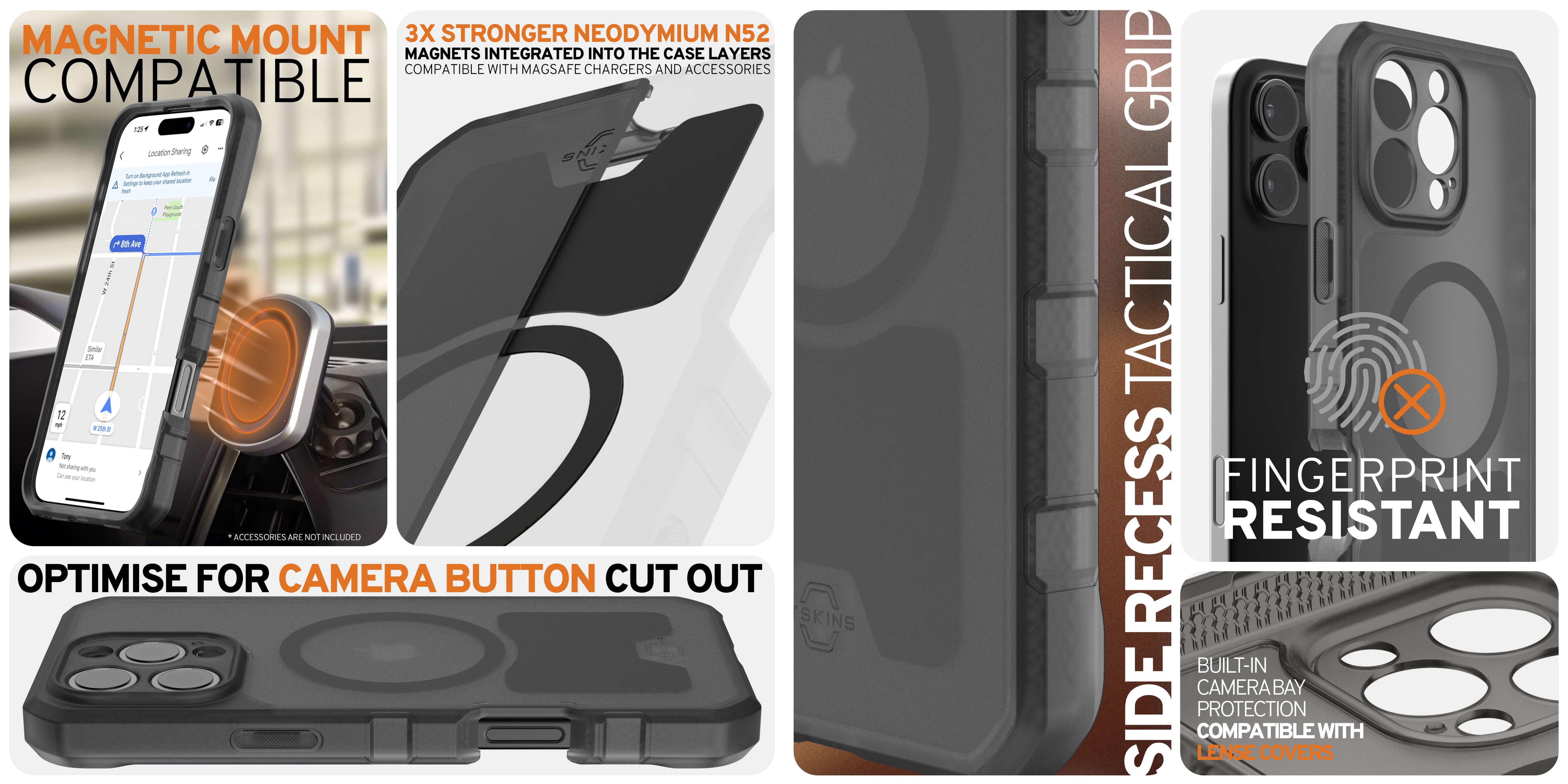 SUPREME R meets MIL-SPECS for military-grade defense, includes a tactical grip for enhanced hand security, and comes with detachable port covers for added protection. Engineered with XXL Air Corners for top-tier impact deflection. Boasts a 3X Stronger MagSafe for maximum attachment strength with accessories.