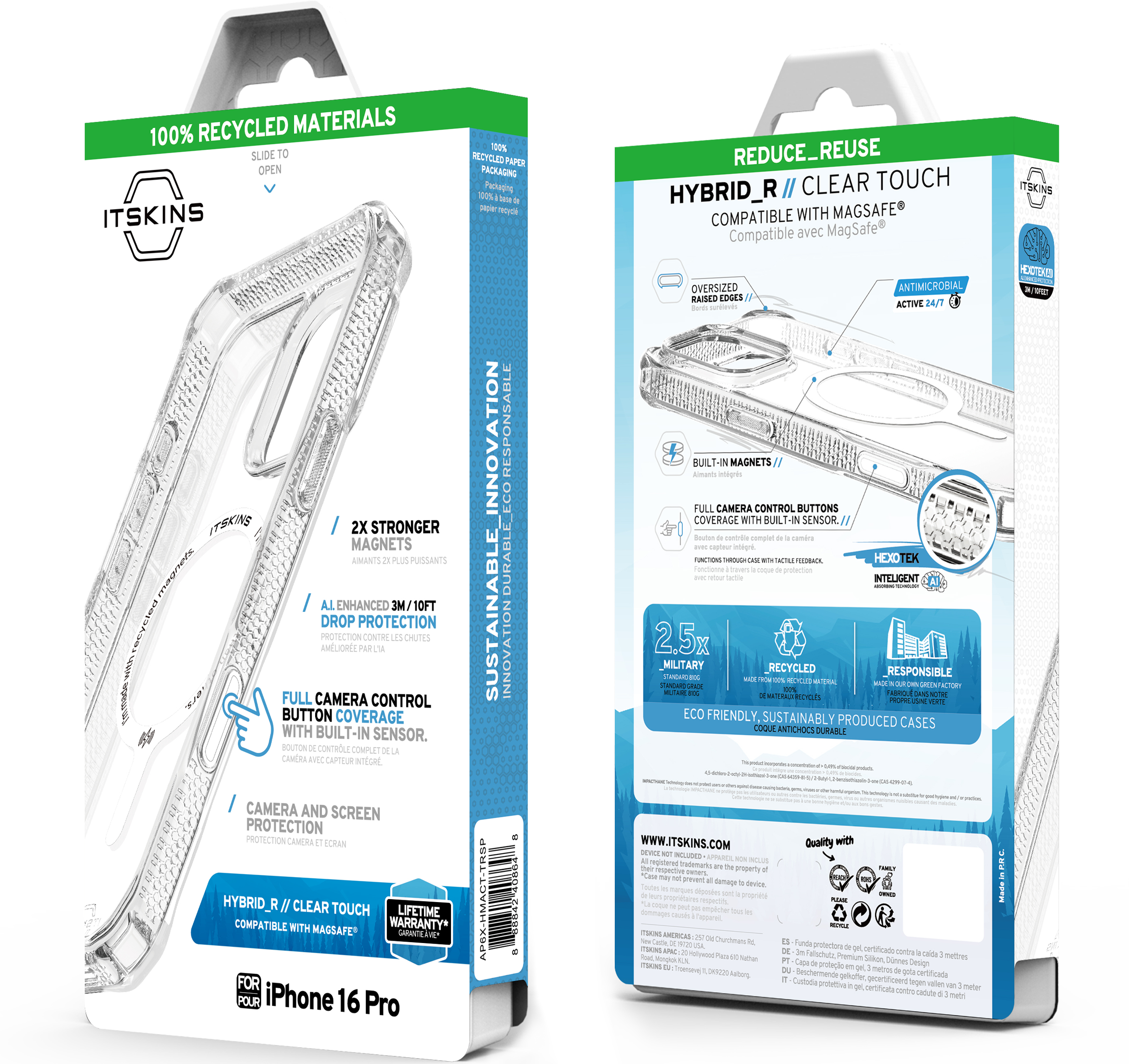 The HYBRID_R TOUCH CLEAR is eco-friendly by design and Global Recycled Standard Certified. It is equipped with air-pocket corners, antimicrobial features, and responsive buttons. Enjoy peace of mind with a lifetime warranty tailored for your endless adventures.