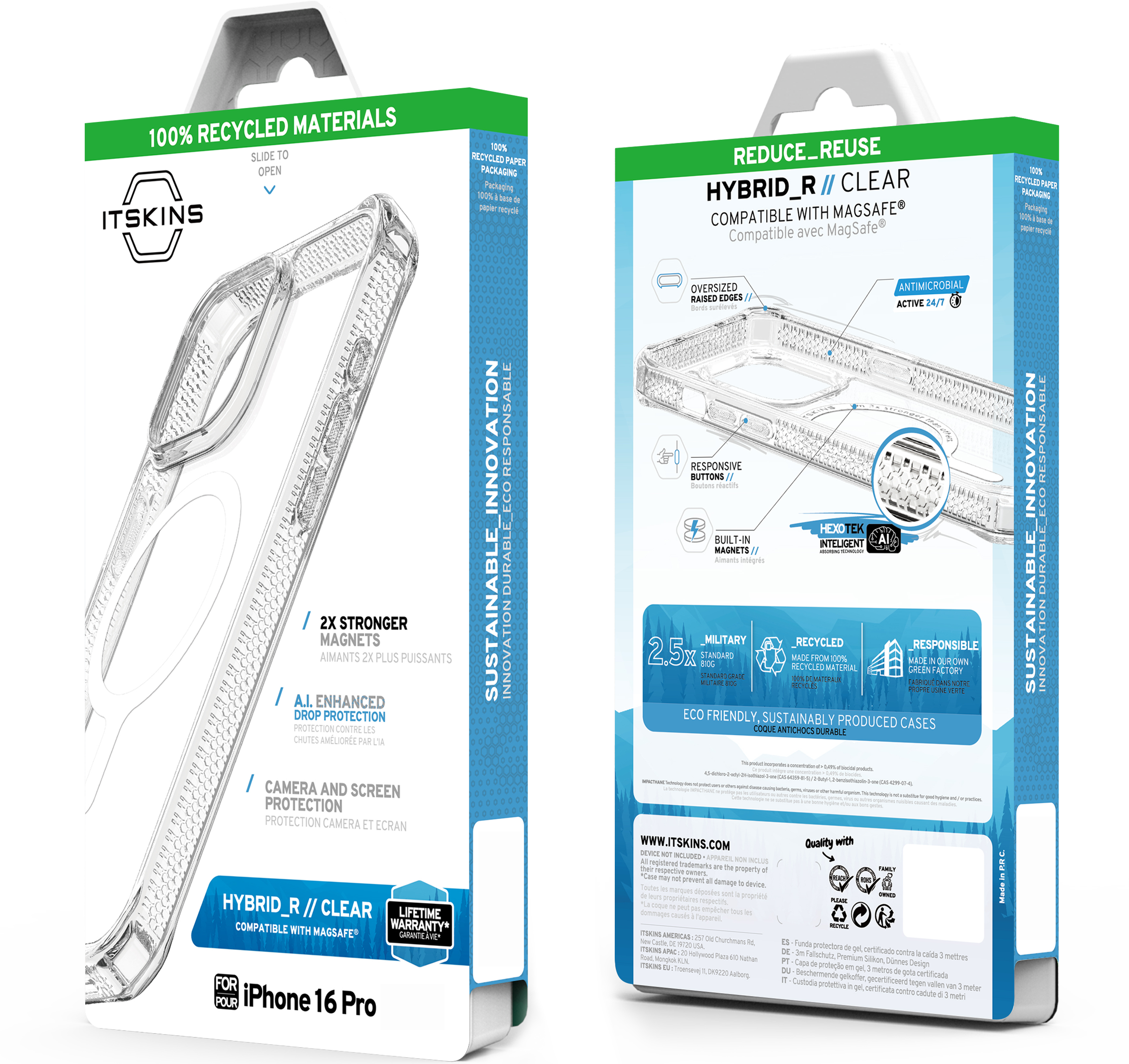 HYBRID_R CLEAR : Crafted for the Active, it features a never-yellowing, crystal-clear rigid polycarbonate back that showcases your phone's beautiful finish, 2X Stronger MagSafe and AI-Enhanced 3M / 10ft Drop Defense. It is Global Recycled Standard Certified, with an Eco-Friendly design incorporating Air-Pocket Corners, Antimicrobial Features, and Responsive Buttons. Comes with a Lifetime Warranty for Endless Adventures.