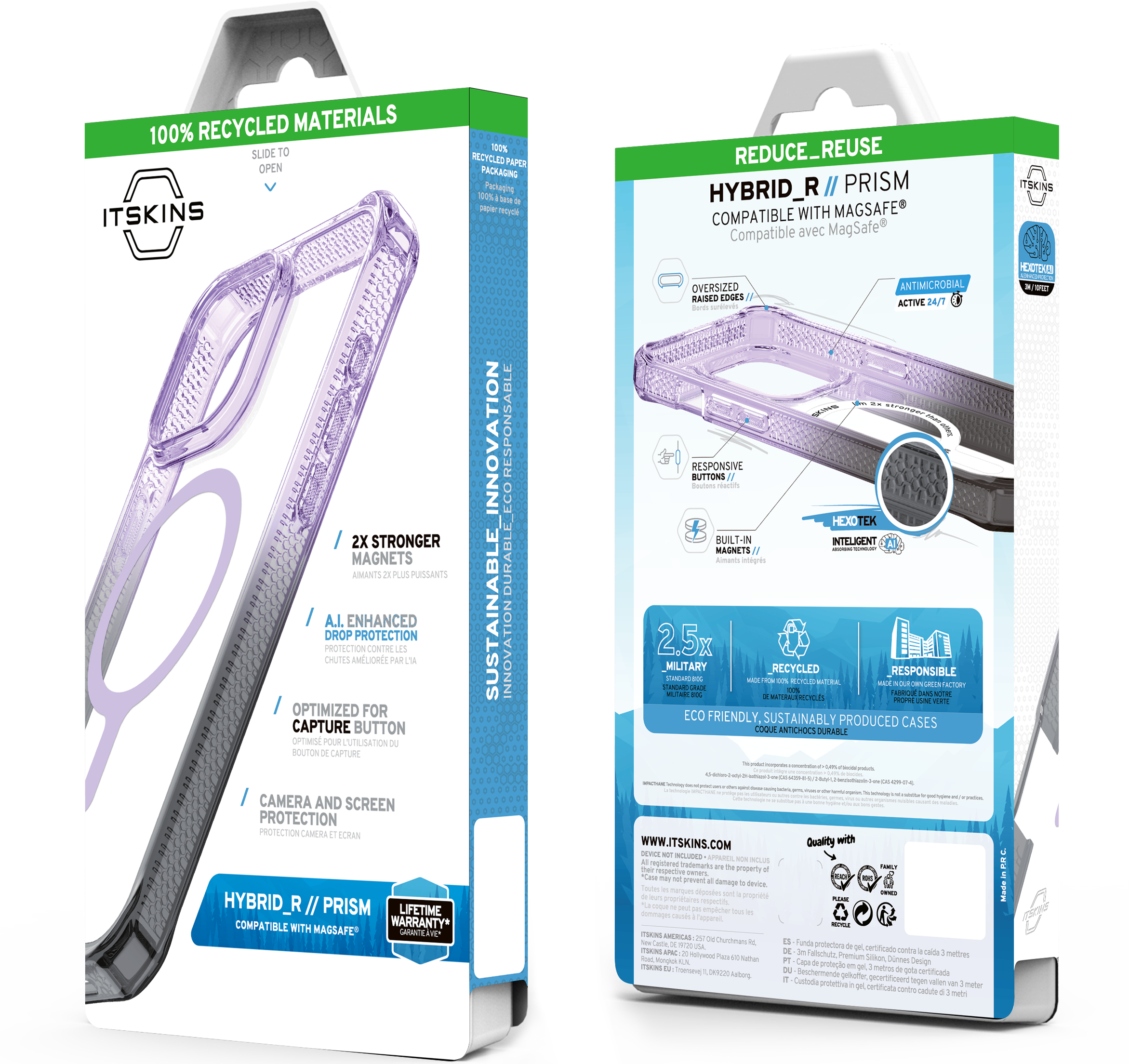 HYBRID_R PRISM : Designed for the Fashion-Forward Active Lifestyle, it Features a Stylish Two-Tone Bumper and a crystal-clear rigid polycarbonate back that showcases your phone's beautiful finish, 2X Stronger MagSafe and AI-Enhanced 3M / 10ft Drop Defense. Global Recycled Standard Certified, with an Eco-Friendly design incorporating Air-Pocket Corners, Antimicrobial Protection, and Responsive Buttons. Lifetime Warranty for the Stylish Adventurer.