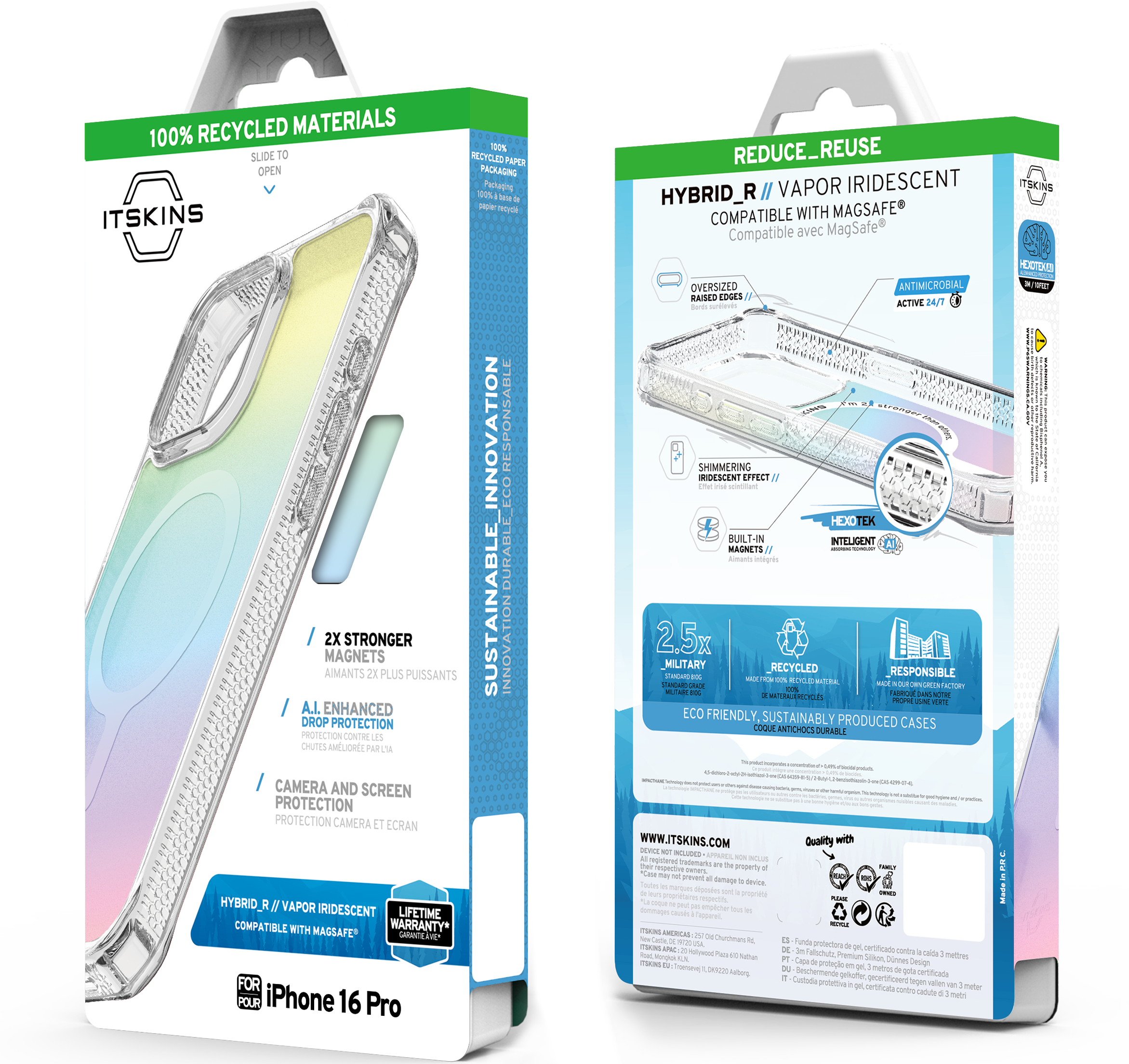 HYBRID R VAPOR IRIDESCENT : showcases a dreamy iridescent effect that shifts colors with movement., AI-enhanced for up to 3M / 10ft impact resistance, and is eco-conscious with Global Recycled Standard Certification. It includes air-pocket corners, antimicrobial properties, and tactile buttons, ensuring a Lifetime Warranty for the actively innovative, "think different" individual.