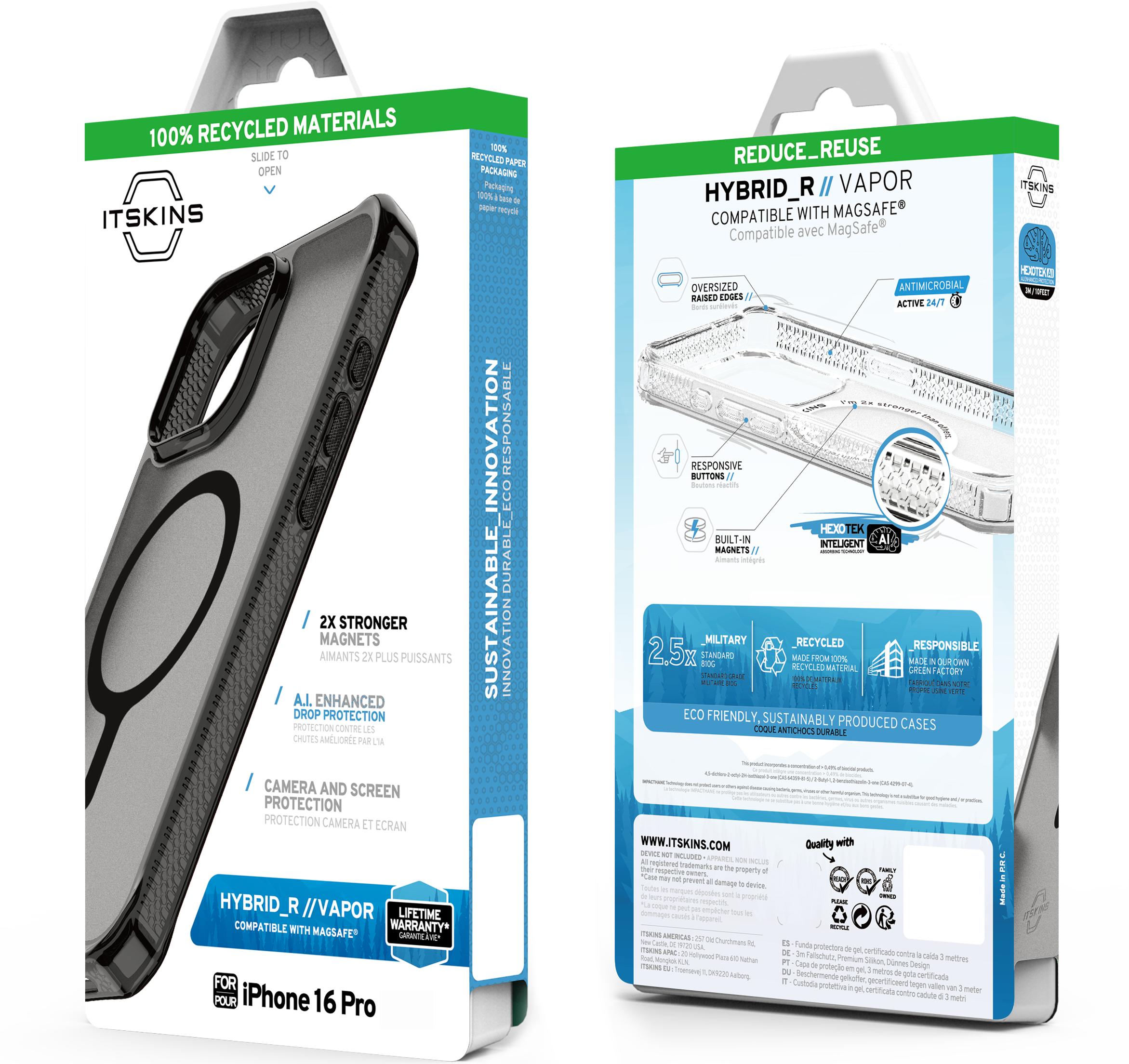 HYBRID R VAPOR : combines a sleek, matte frosted hardback with a glossy clear bumper, showcasing your phone's titanium trim. Its fingerprint-resistant, anti-scratch back surface maintains beauty over time. It is integrated with 2X Stronger MagSafe for secure attachment, AI-optimized for up to 3M / 10ft drop protection, and eco-friendly with Global Recycled Standard Certification. Equipped with air-pocket corners, antimicrobial defense, and responsive buttons, it's prepared for any adventure with a Lifetime Warranty.