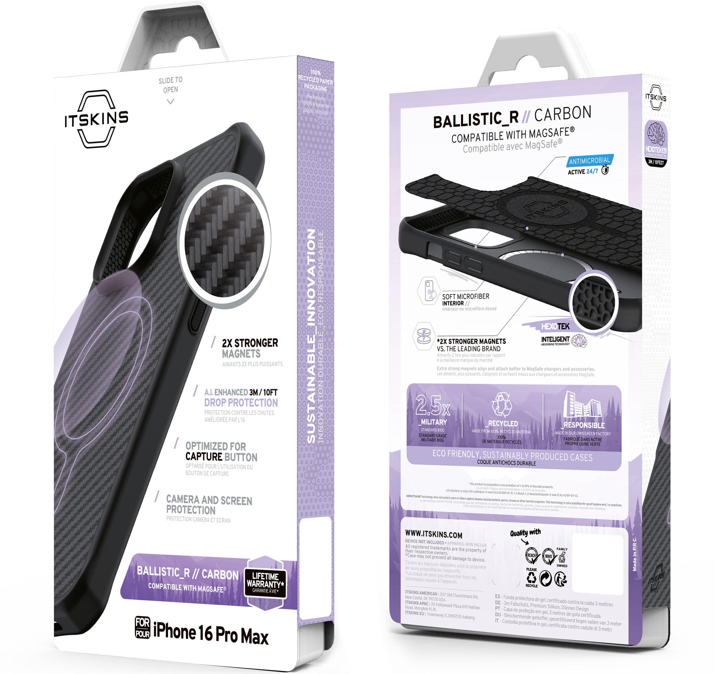 HYBRID R // CARBON : combines a real carbon weave back for rugged style and durability with a textured solid bumper for enhanced grip. It boasts a 2X Stronger MagSafe for secure attachment, is AI-enhanced to withstand drops up to 3m / 10ft, and is eco-friendly with Global Recycled Standard Certification. Includes features like air-pocket corners, antimicrobial protection, and responsive buttons, making it perfect for an active lifestyle, all supported by a lifetime warranty.