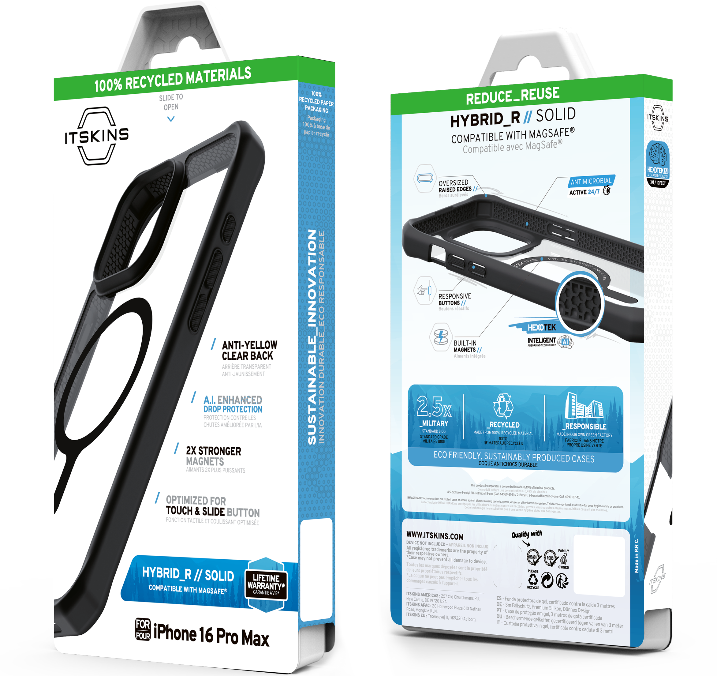 HYBRID_R SOLID : features a textured solid bumper for enhanced grip, a never-yellowing, crystal clear rigid polycarbonate back that showcases the beautiful finish of your phone, melded with 2x stronger MagSafe and AI-enhanced 3M / 10ft drop defense. Eco-conscious with Global Recycled Standard certification, air-pocket corners, antimicrobial protection, and tactile buttons. Adventure-ready with a lifetime warranty.