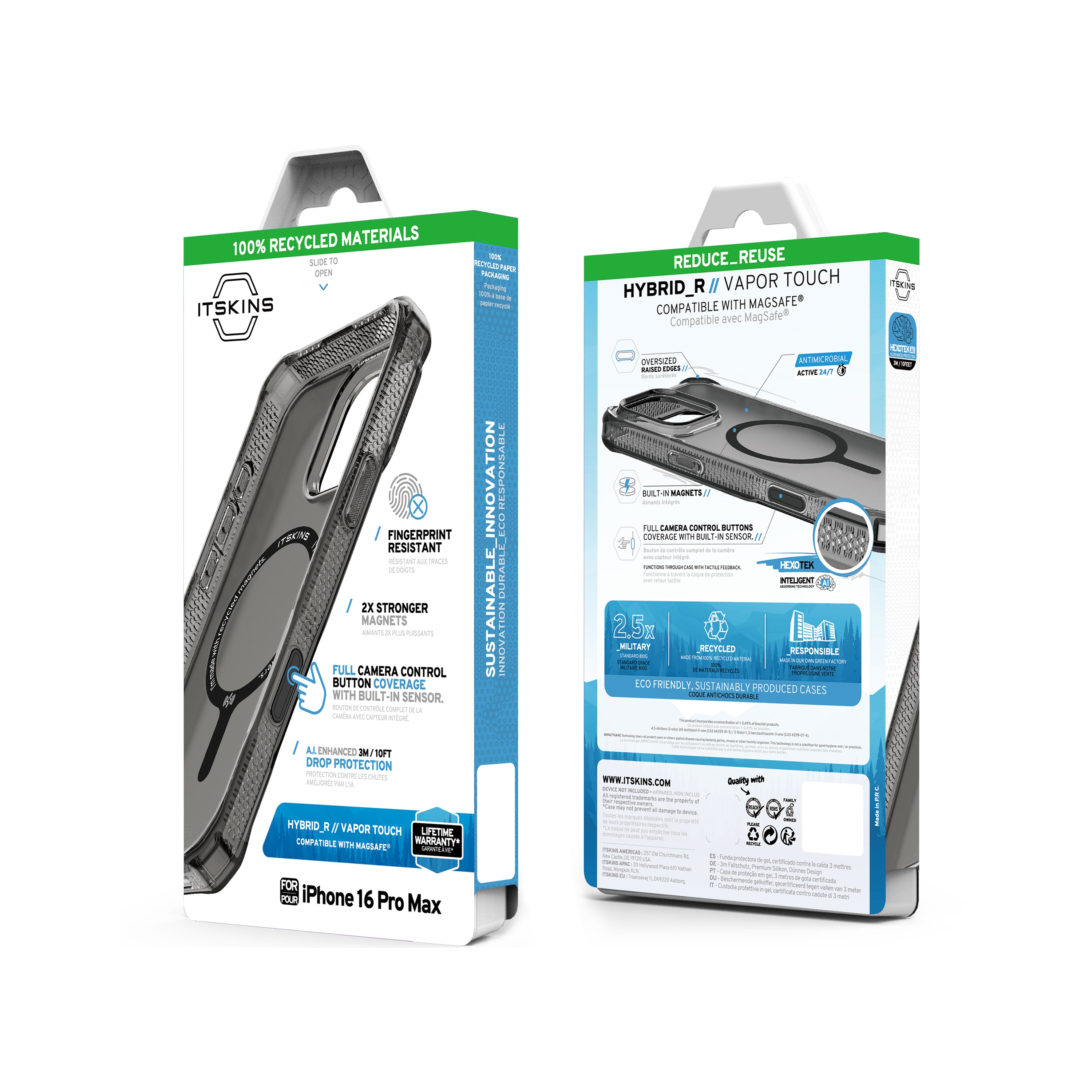 HYBRID R // VAPOR TOUCH now features a protective touch button designed to enhance interaction with your iPhone's Control button without sacrificing sensitivity. Combines a sleek, matte frosted hardback with a glossy clear bumper, showcasing your phone's titanium trim. Its fingerprint-resistant, anti-scratch back surface maintains beauty over time. It is integrated with 2X Stronger MagSafe for secure attachment, AI-optimized for up to 3M / 10ft drop protection, and eco-friendly with Global Recycled Standard Certification. Equipped with air-pocket corners, antimicrobial defense, and responsive buttons, it's prepared for any adventure with a Lifetime Warranty.