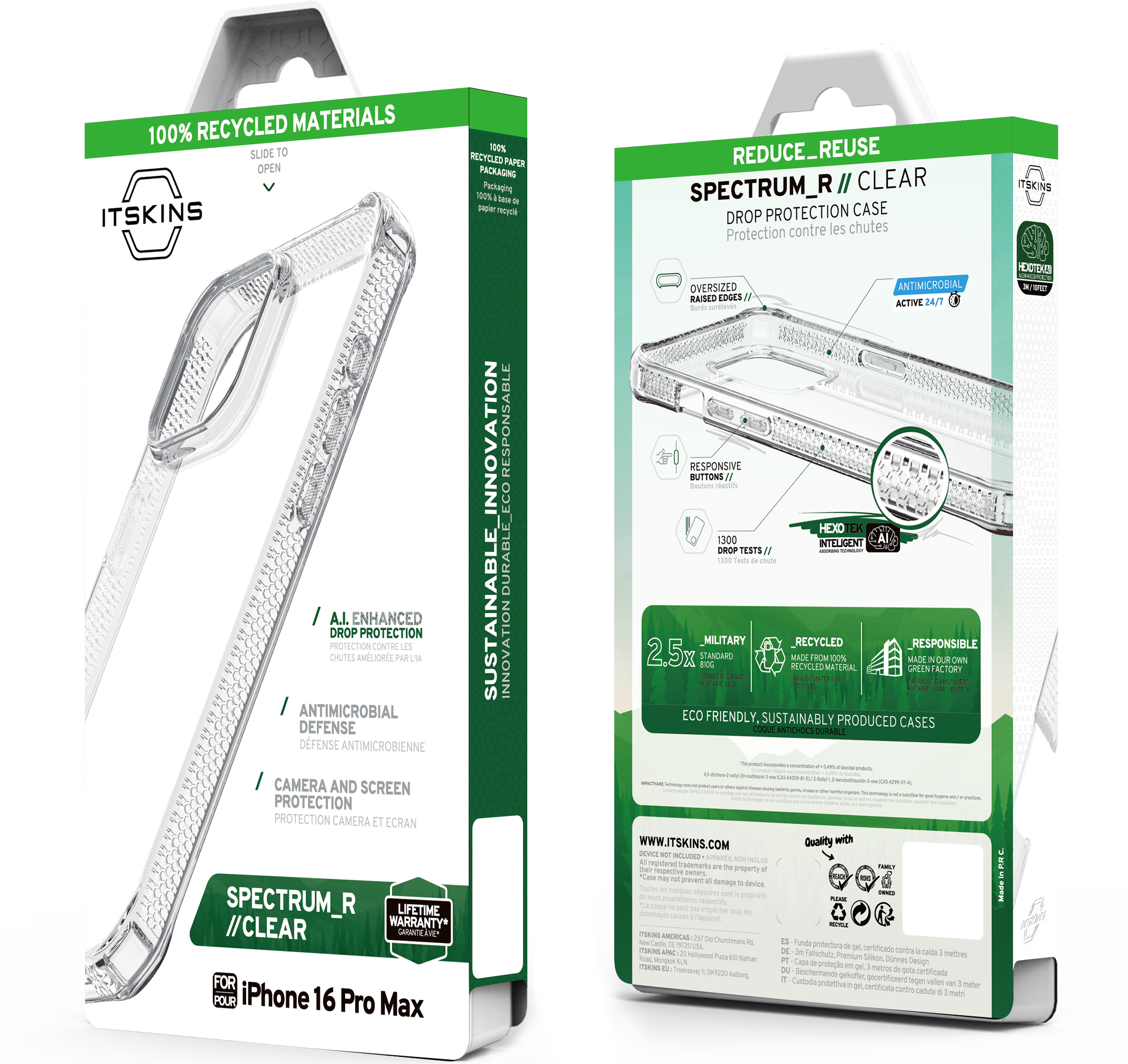 SPECTRUM_R CLEAR : Proprietary True Clear, Certified 100% Recycled, Mono-Material for Simplified Recycling. Offers AI-Enhanced Drop Protection up to 3M / 10FT, Superior Anti-Yellowing, and Antimicrobial Defense.