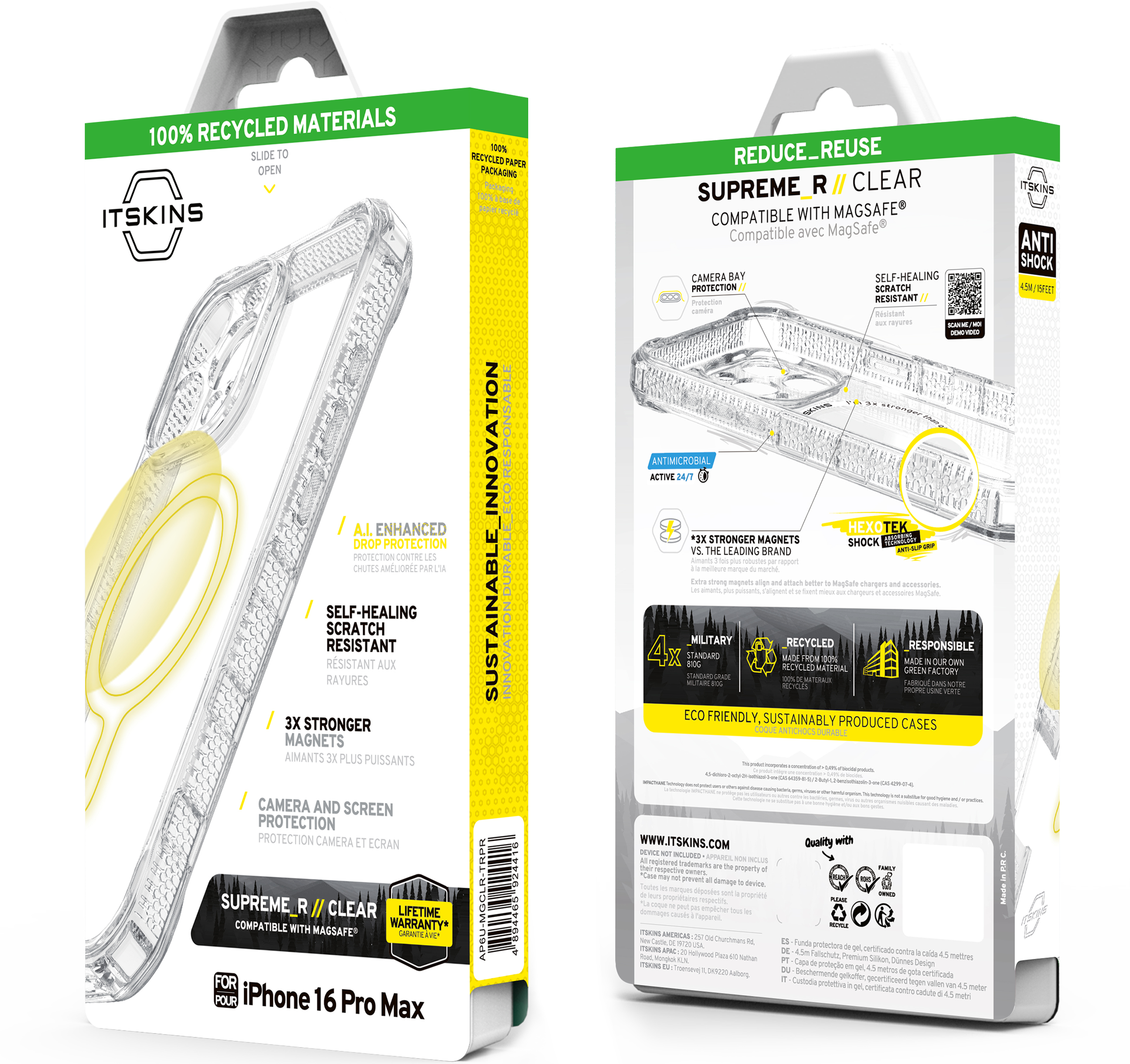 SUPREME_R meets MIL-SPECS for armored defense, with a tactical grip design for added security in hand. Engineered with XXL Air Corners for advanced impact deflection. Boasts 3X Stronger MagSafe for maximum attachment strength with accessories. Eco-designed and Global Recycled Standard Certified for sustainable protection.
