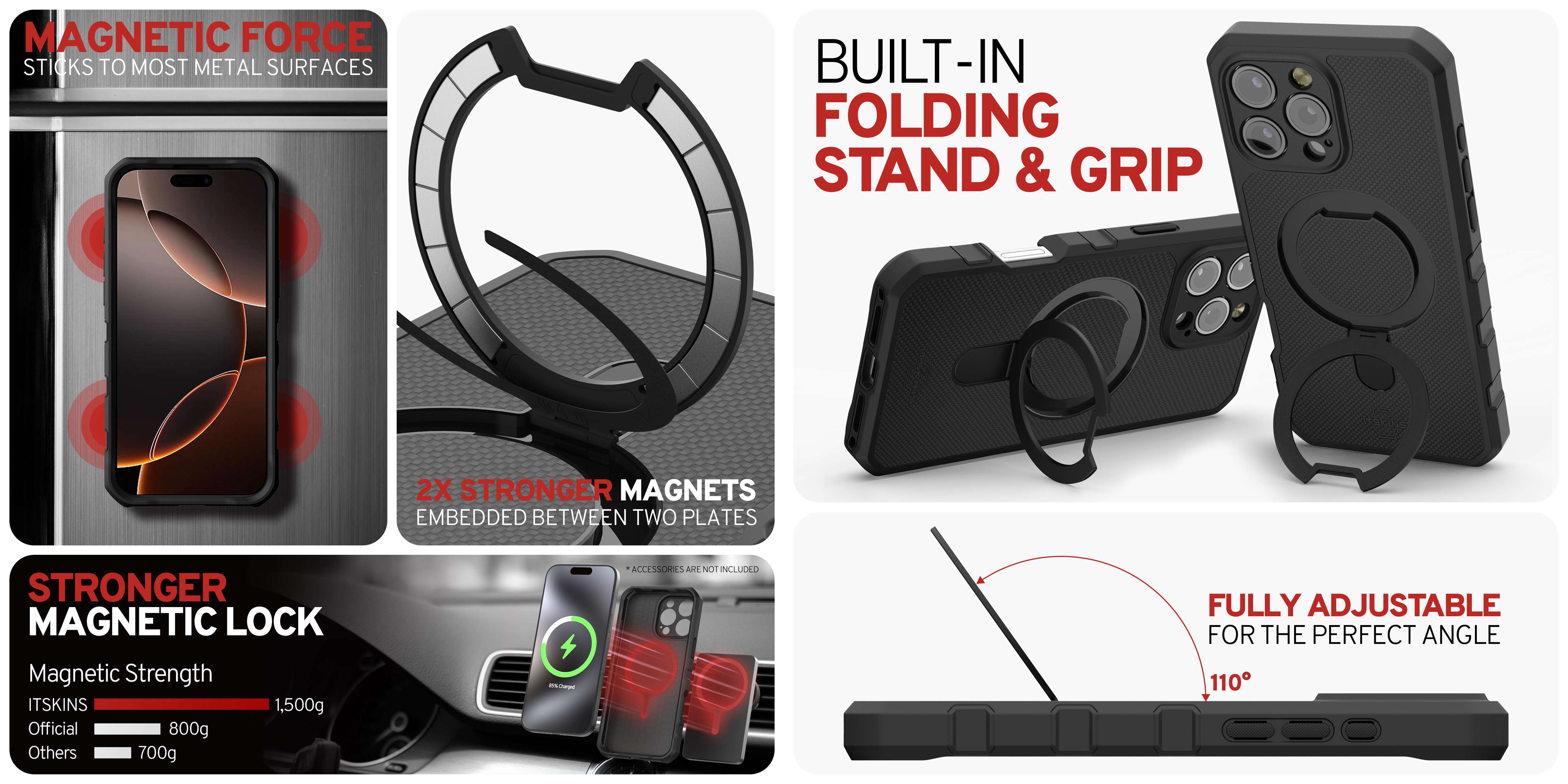 SUPREME_R meets MIL-SPECS for military-grade defense, includes a tactical grip for enhanced hand security, and comes with detachable port covers for added protection. Engineered with XXL Air Corners for top-tier impact deflection and boasts a 3X Stronger MagSafe for maximum attachment strength to accessories.