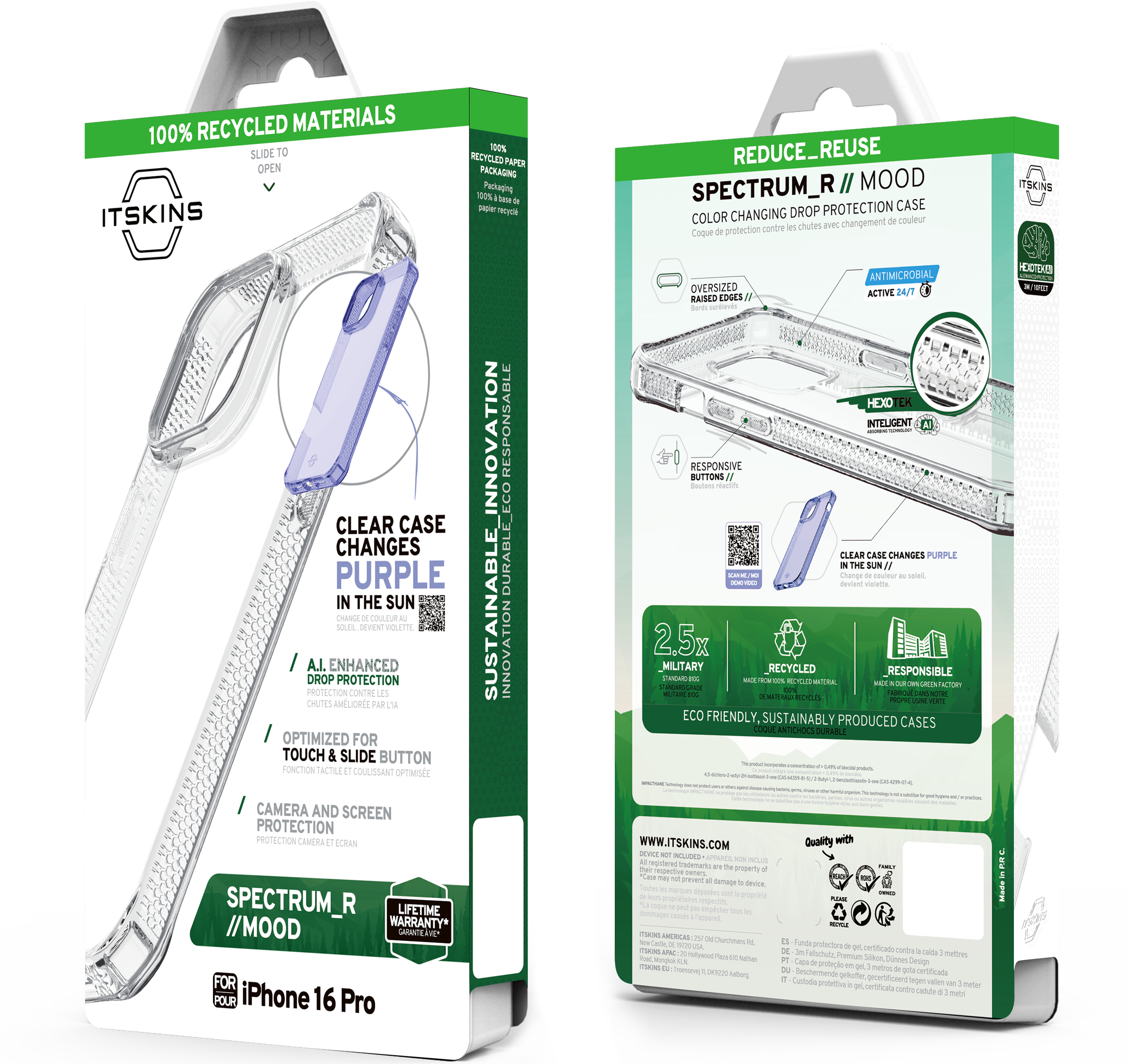 Add a little sunshine to your life with SPECTRUM R // MOOD from ITSKINS. This unique case starts out clear then changes color in the sun. But don’t forget, this case provides drop protection to your device from up to 3M /10 Feet. It’s made from recycled materials and the raised edges help prevent scratches to your screen and camera.