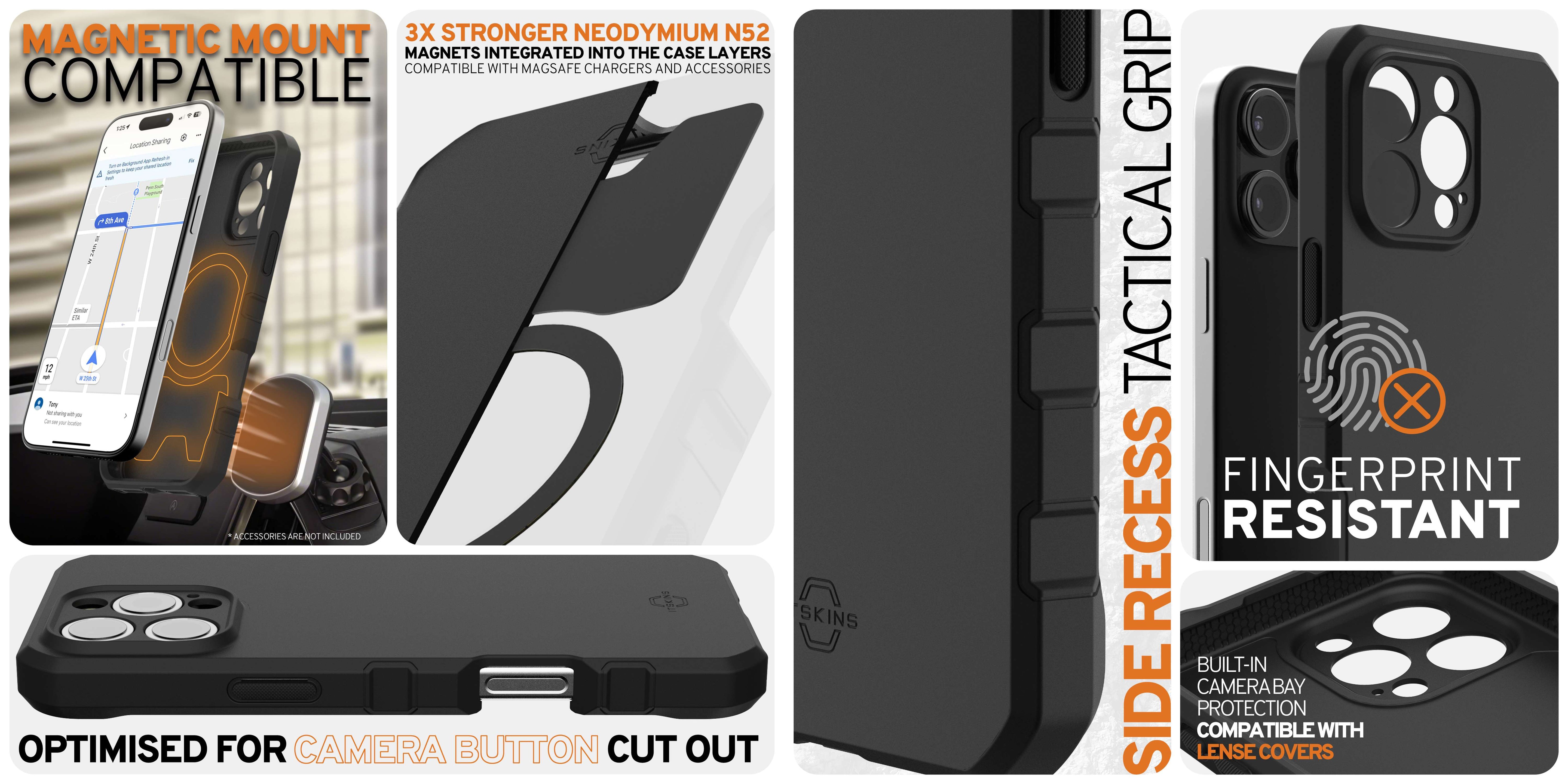 SUPREME R  meets MIL-SPECS for military-grade defense, includes a tactical grip for enhanced hand security, and comes with detachable port covers for added protection. Engineered with XXL Air Corners for top-tier impact deflection. Boasts a 3X Stronger MagSafe for maximum attachment strength with accessories.