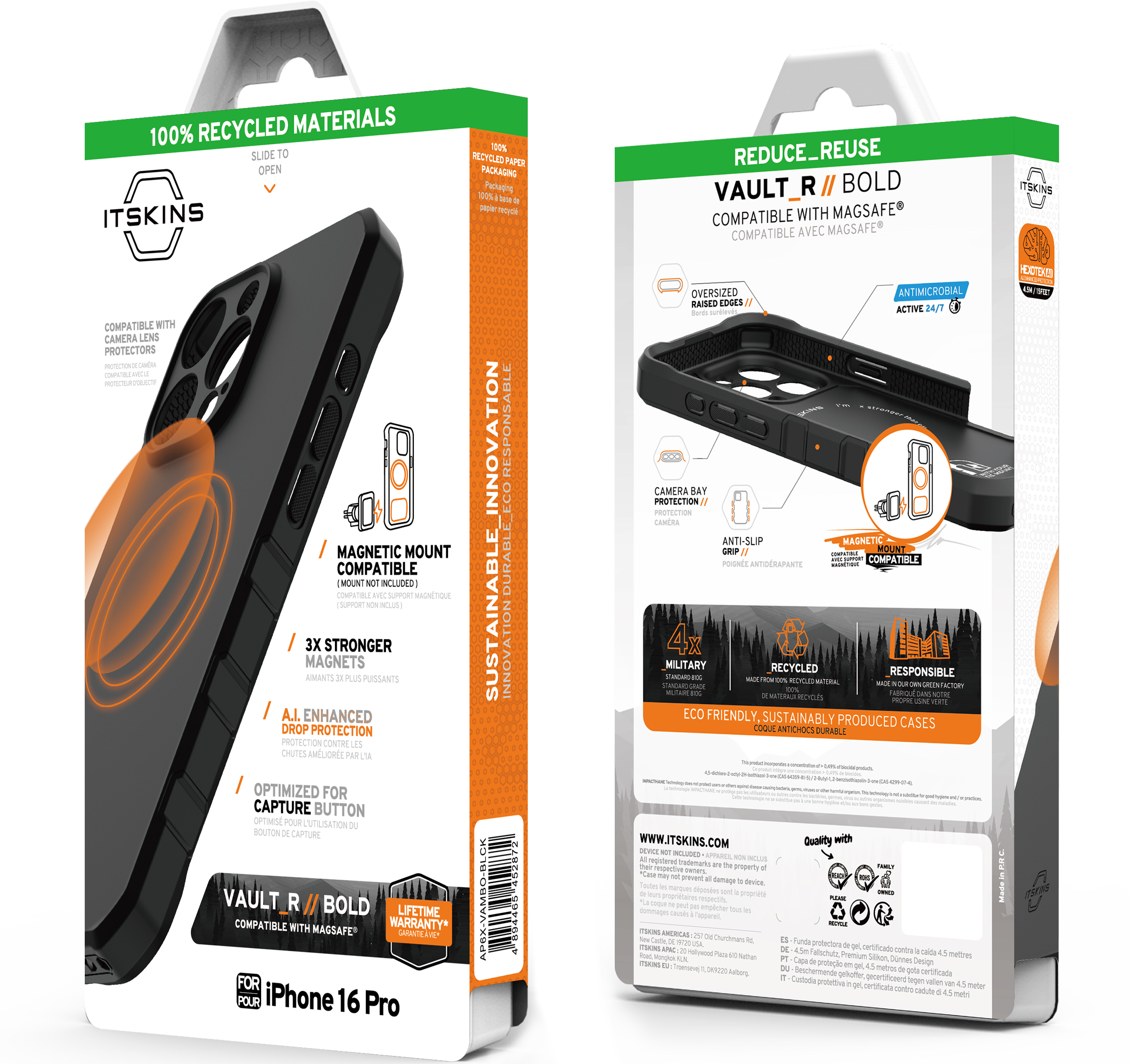 SUPREME R // BOLD : is one of our most protective case. Equipped with a Built-in Metal Plate compatible with car mounts for those needing a stronger attachment option than MagSafe provides. Enhanced with AI technology, it offers superior impact absorption around the interior perimeter, protecting your device from drops up to 4.5M / 15 Feet.
