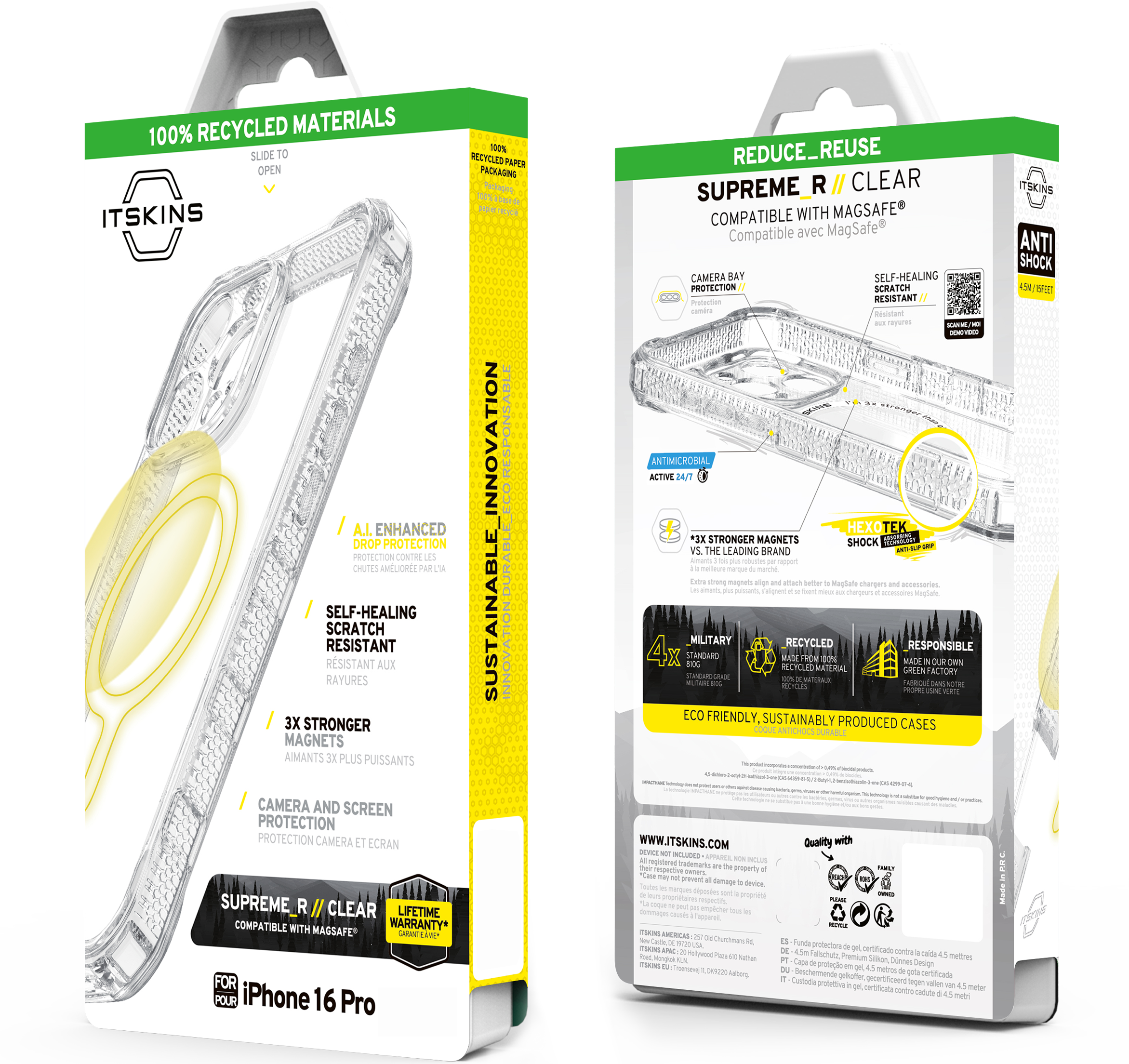 SUPREME_R meets MIL-SPECS for armored defense, with a tactical grip design for added security in hand. Engineered with XXL Air Corners for advanced impact deflection. Boasts 3X Stronger MagSafe for maximum attachment strength with accessories. Eco-designed and Global Recycled Standard Certified for sustainable protection.