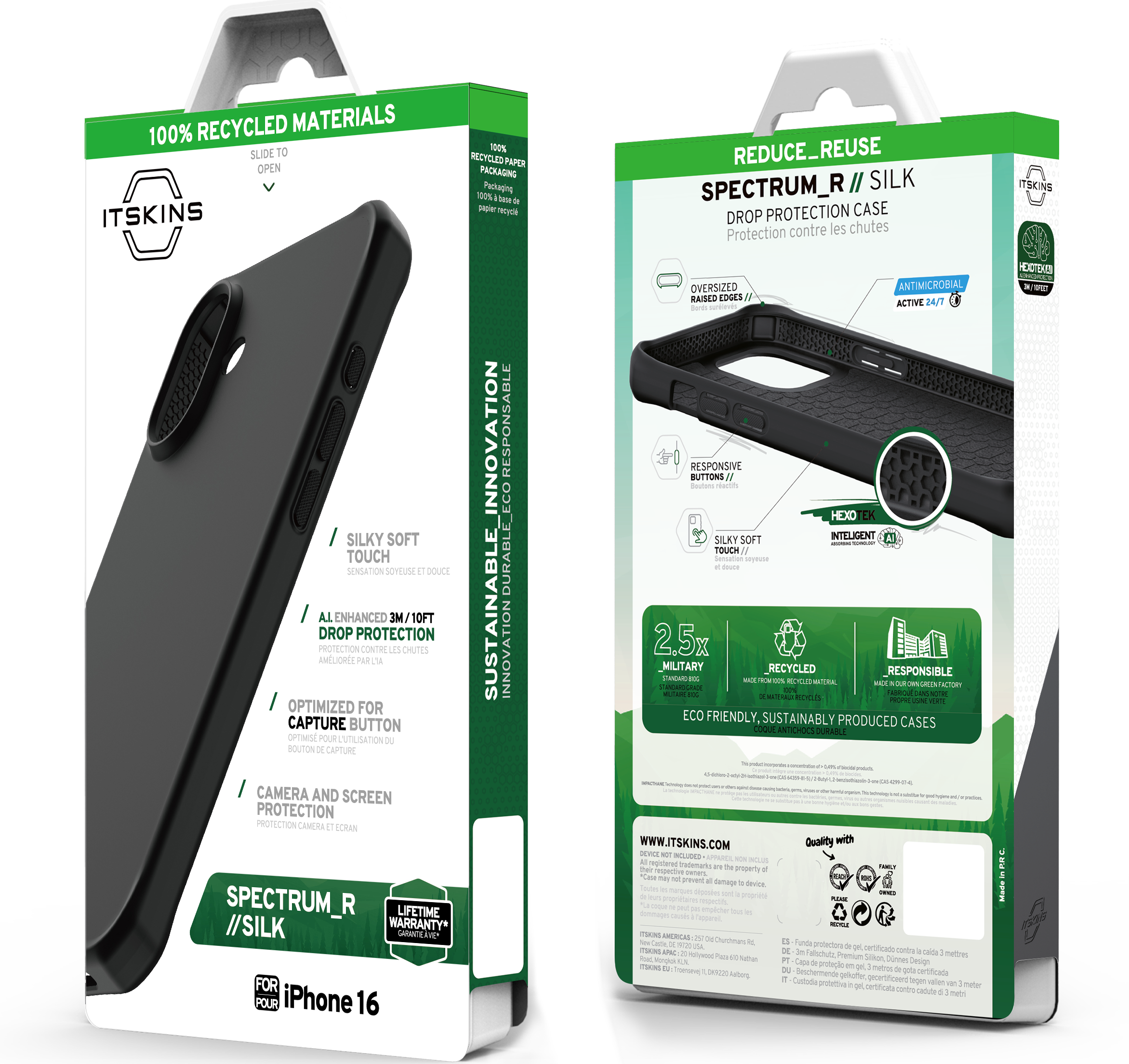 SPECTRUM_R SILK: Silky-Soft Touch, Certified 100% Recycled, Mono-Material for Simplified Recycling. Offers AI-Enhanced Drop Protection up to 3M / 10FT, Fingerprint resistant, and Antimicrobial Defense.