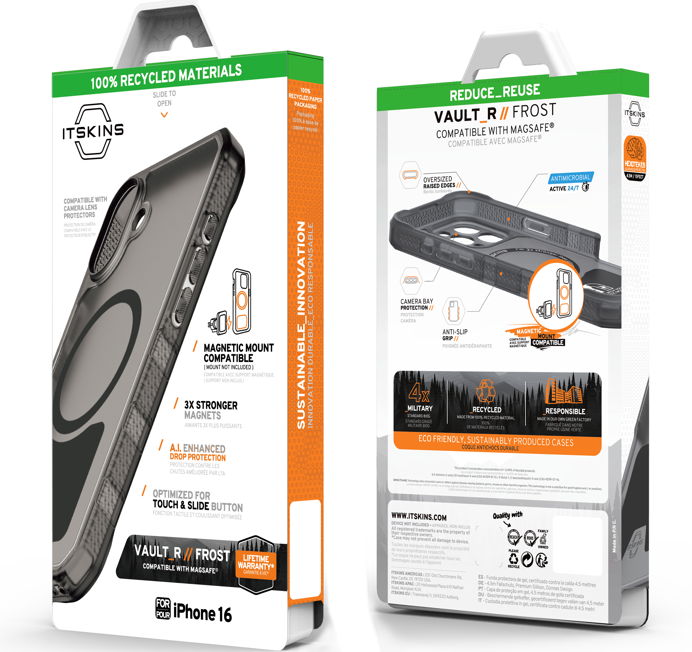 SUPREME R // FROST : is our most protective case. Equipped with a Built-in Metal Plate compatible with car mounts for those needing a stronger attachment option than MagSafe provides. Enhanced with AI technology, it offers superior impact absorption around the interior perimeter, protecting your device from drops up to 4.5M / 15 Feet.