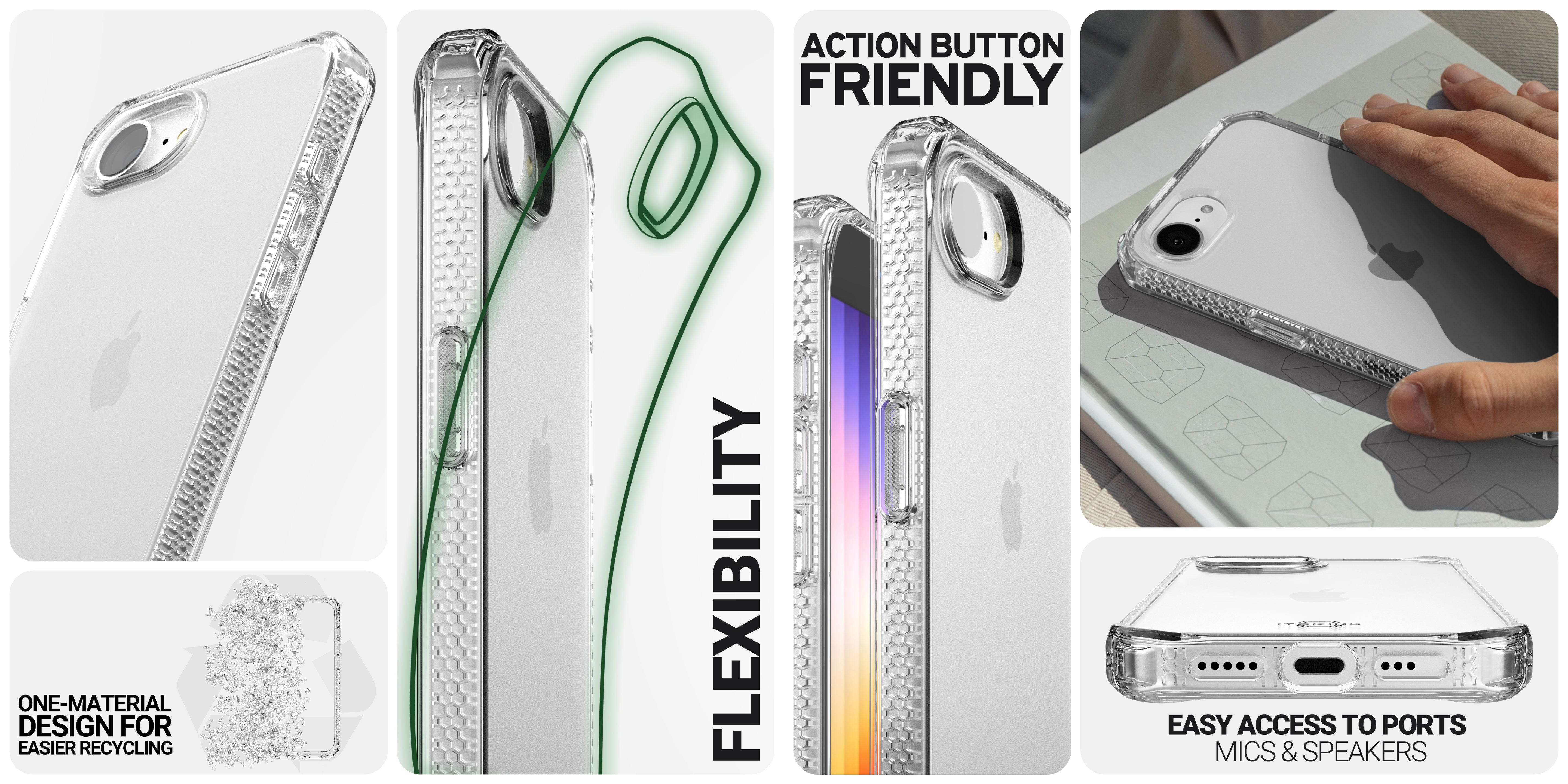 SPECTRUM_R CLEAR : Proprietary True Clear, Certified 100% Recycled, Mono-Material for Simplified Recycling. Offers AI-Enhanced Drop Protection up to 3M / 10FT, Superior Anti-Yellowing, and Antimicrobial Defense.