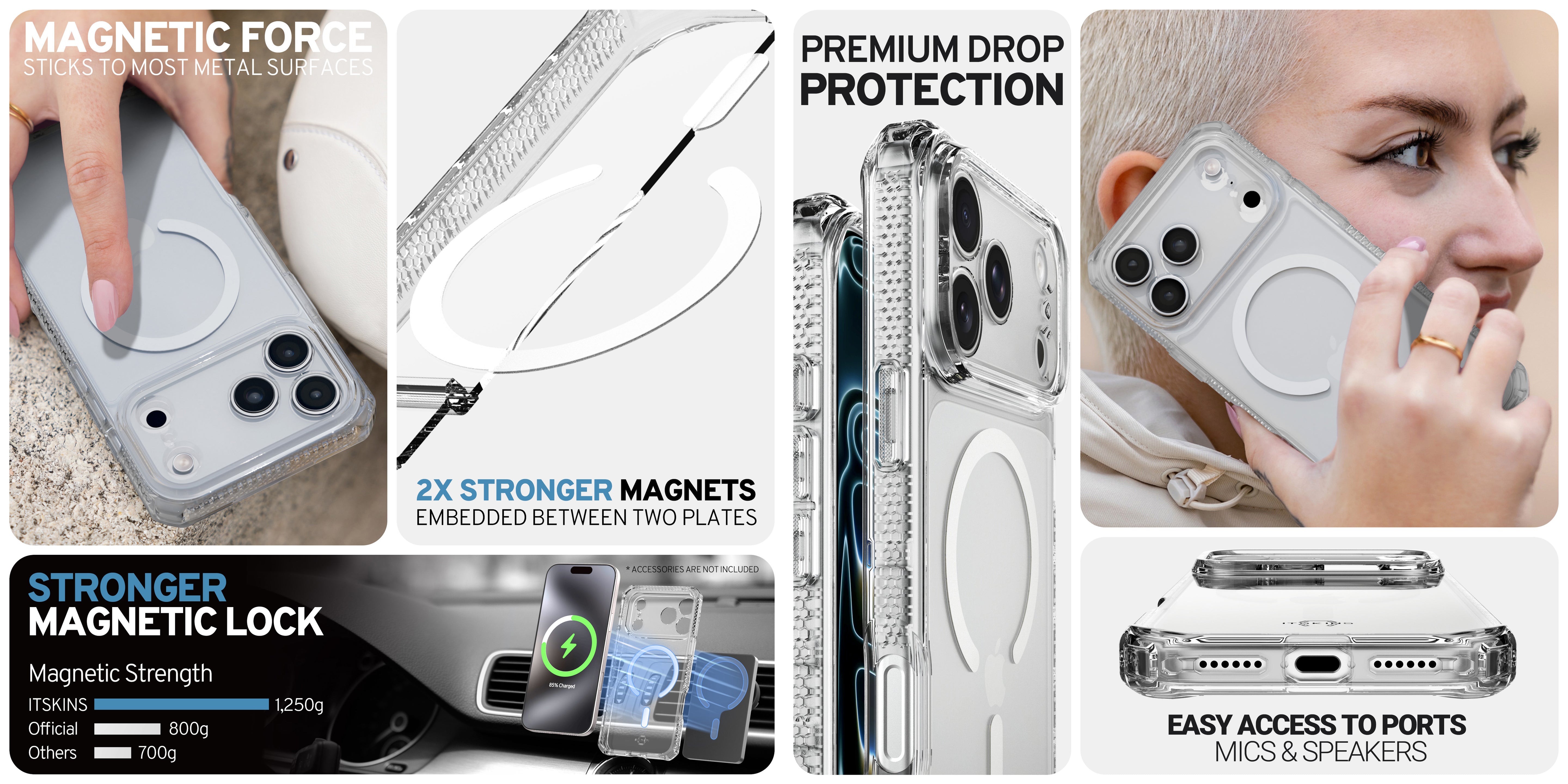 HYBRID_R CLEAR : Crafted for the Active, it features a never-yellowing, crystal-clear rigid polycarbonate back that showcases your phone's beautiful finish, 2X Stronger MagSafe and AI-Enhanced 3M / 10ft Drop Defense. It is Global Recycled Standard Certified, with an Eco-Friendly design incorporating Air-Pocket Corners, Antimicrobial Features, and Responsive Buttons. Comes with a Lifetime Warranty for Endless Adventures.