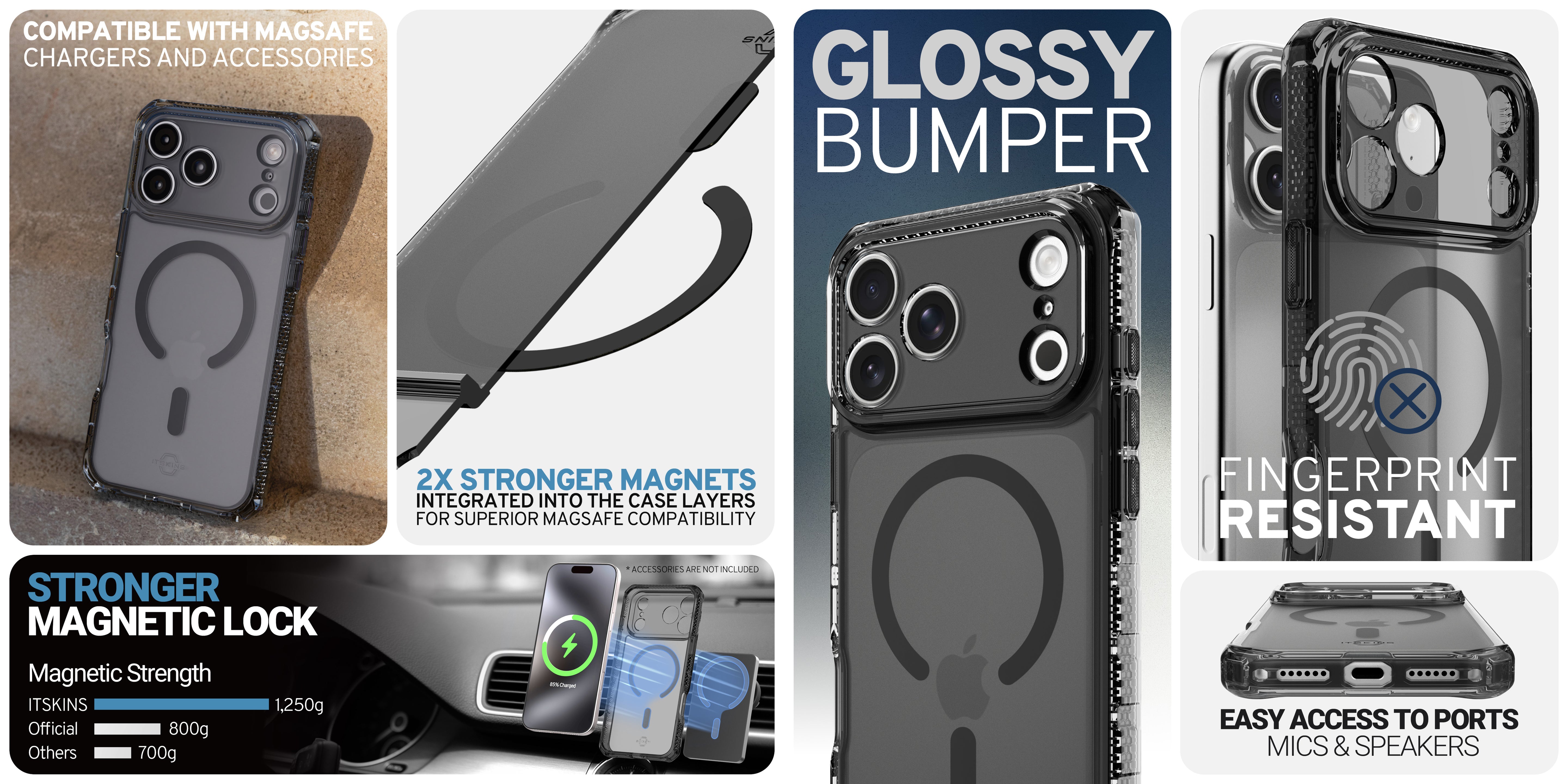 HYBRID R VAPOR : combines a sleek, matte frosted hardback with a glossy clear bumper, showcasing your phone's titanium trim. Its fingerprint-resistant, anti-scratch back surface maintains beauty over time. It is integrated with 2X Stronger MagSafe for secure attachment, AI-optimized for up to 3M / 10ft drop protection, and eco-friendly with Global Recycled Standard Certification. Equipped with air-pocket corners, antimicrobial defense, and responsive buttons, it's prepared for any adventure with a Lifetime Warranty.
