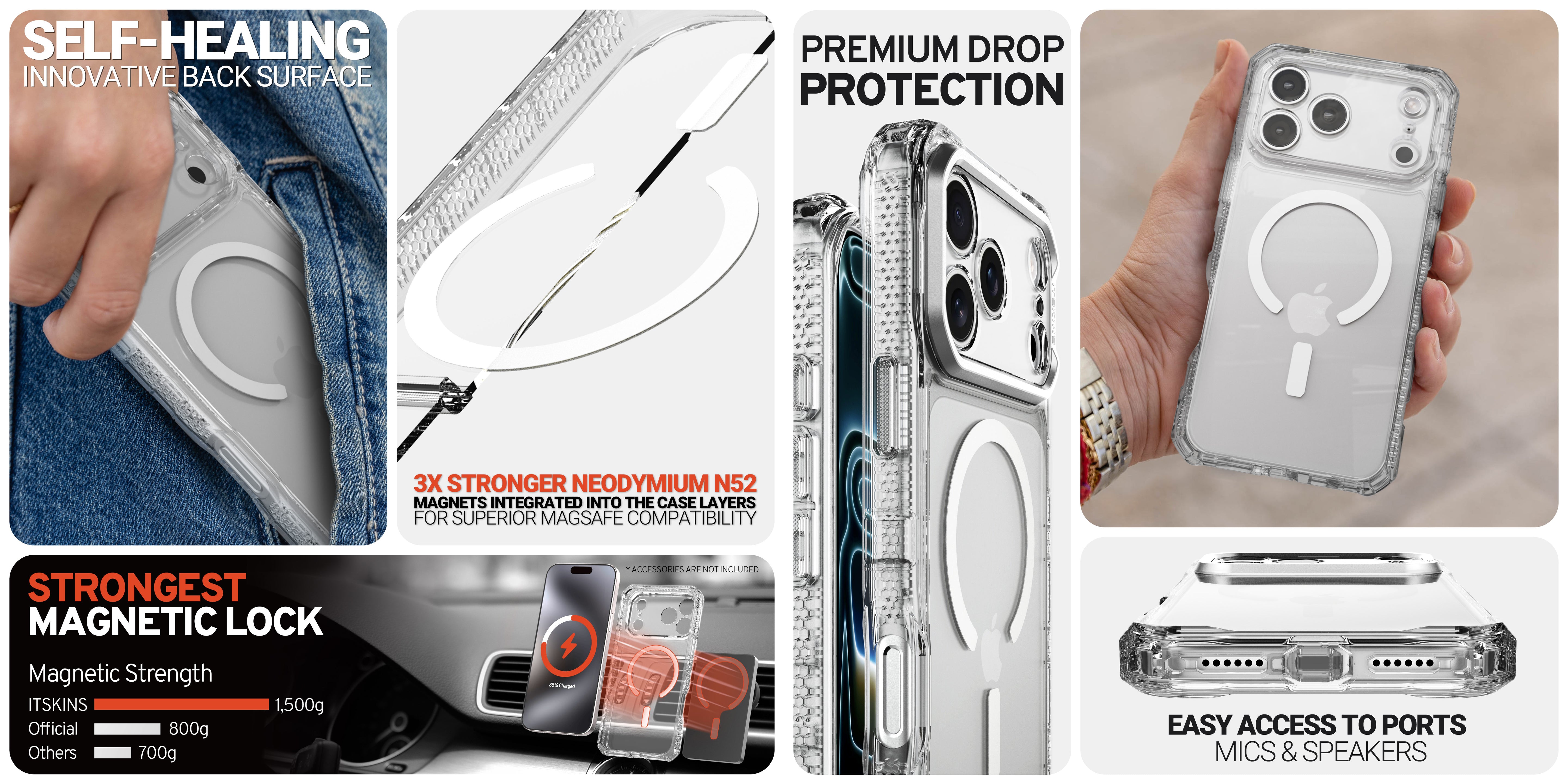 SUPREME_R CLEAR : features a self-healing, scratch-resistant surface for superior clarity and durability, providing extreme drop protection. Enhanced with AI technology for reinforced impact absorption around the interior perimeter, it ensures safety from drops up to 4.5M / 15 Feet.