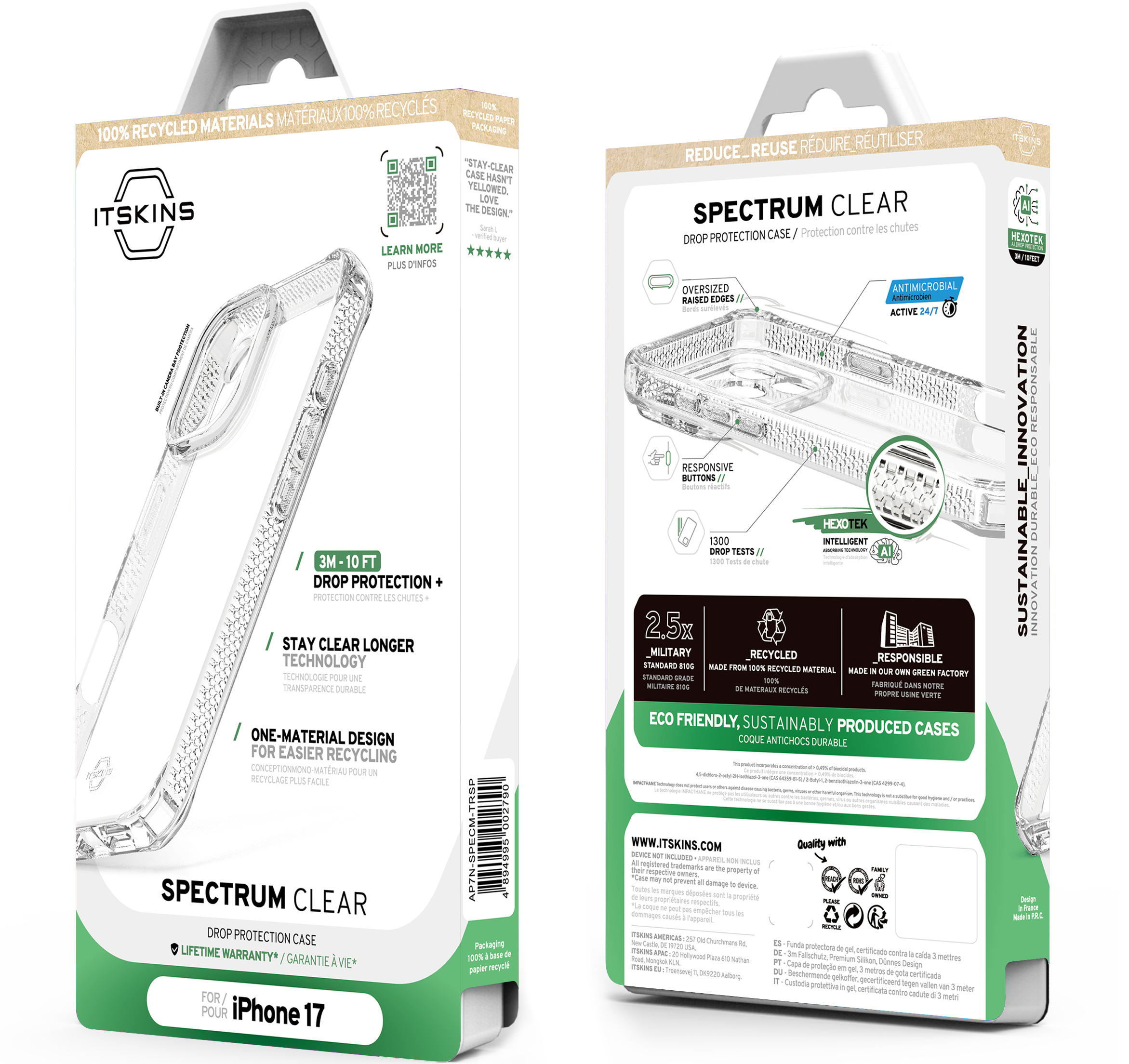 SPECTRUM_R CLEAR : Proprietary True Clear, Certified 100% Recycled, Mono-Material for Simplified Recycling. Offers AI-Enhanced Drop Protection up to 3M / 10FT, Superior Anti-Yellowing, and Antimicrobial Defense.