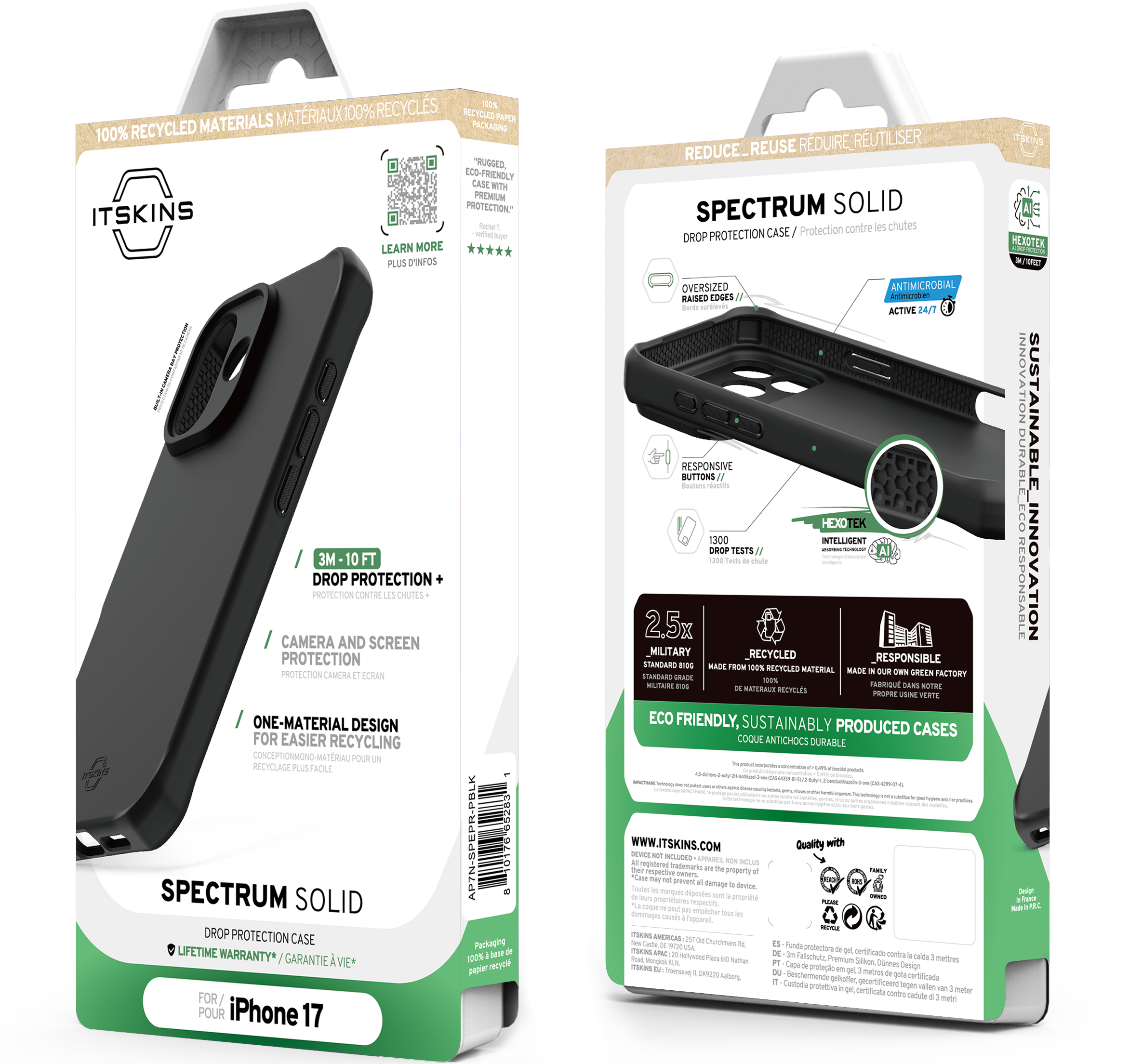 SPECTRUM_R // SOLID has a rugged, solid surface and has been certified by the Global Recycled Standard for using 100% recyclable materials and produced with sustainably. It delivers premium drop protection and antimicrobial defense.