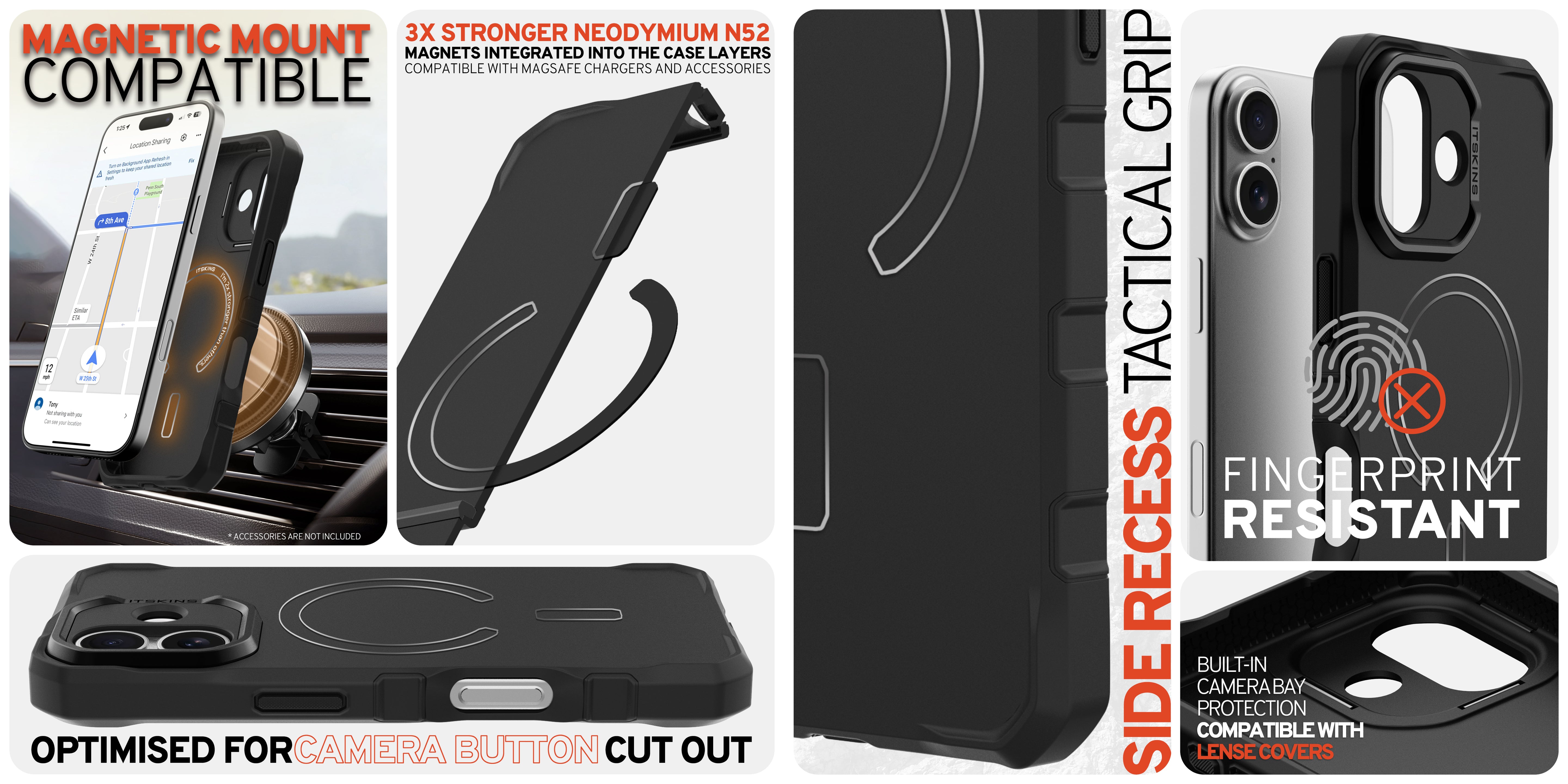 SUPREME R // BOLD : is one of our most protective case. Equipped with a Built-in Metal Plate compatible with car mounts for those needing a stronger attachment option than MagSafe provides. Enhanced with AI technology, it offers superior impact absorption around the interior perimeter, protecting your device from drops up to 4.5M / 15 Feet.