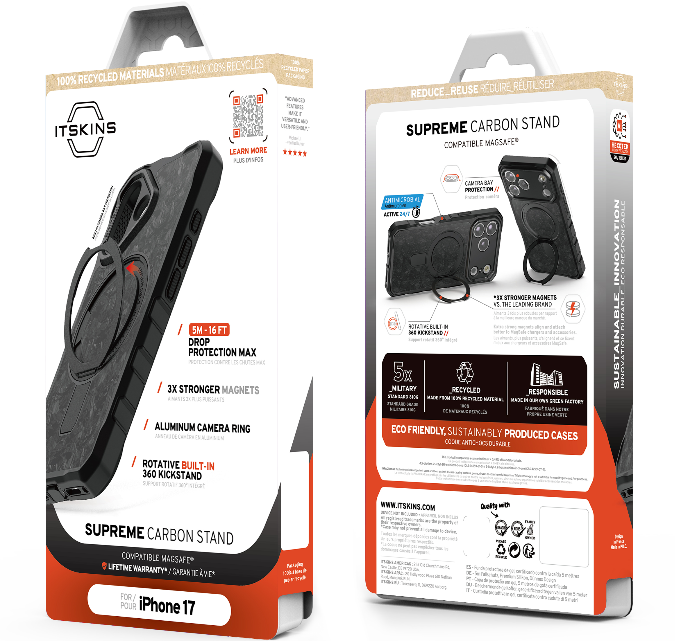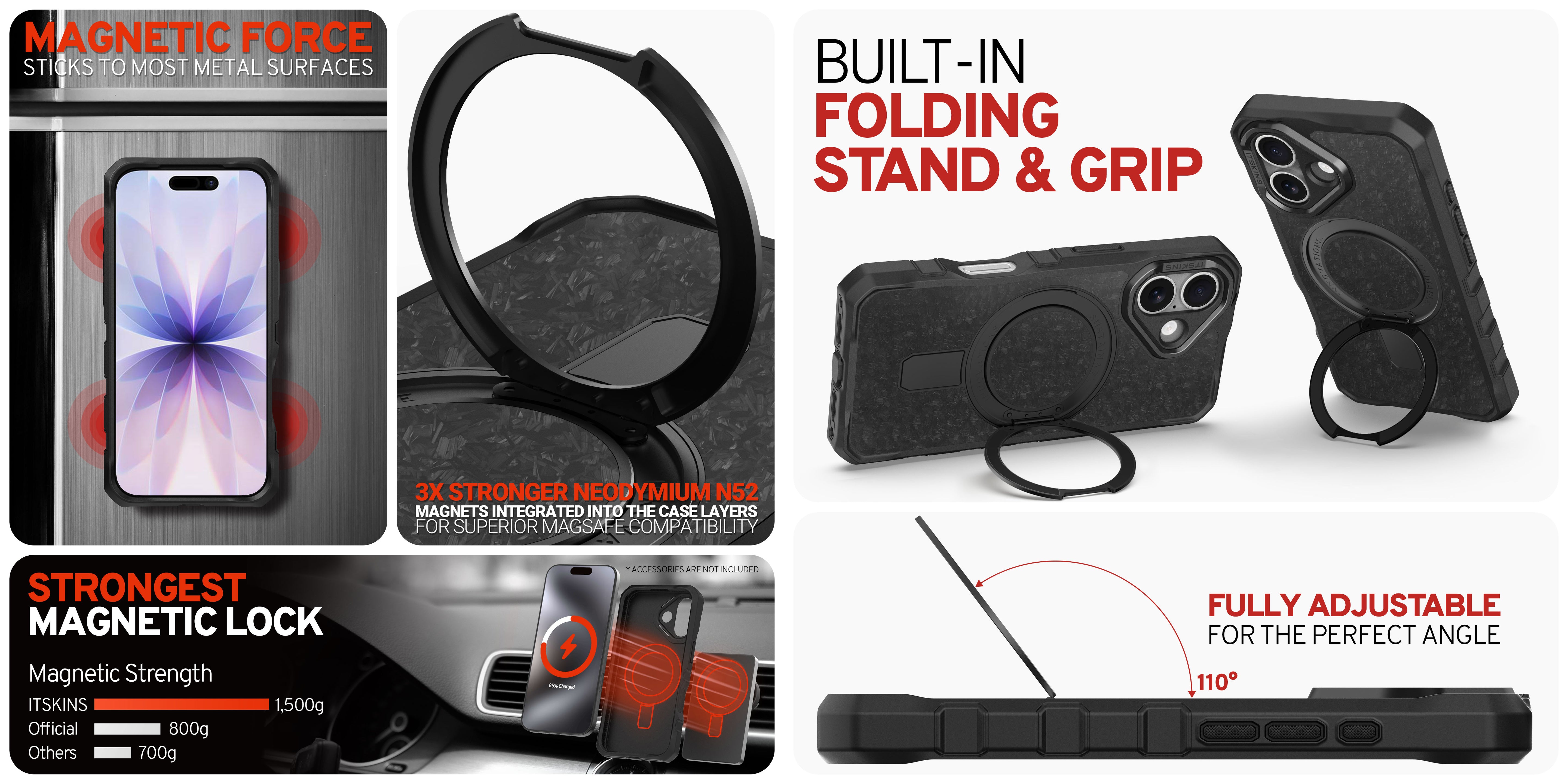 SUPREME R // STAND CARBON : is the ultimate case with numerous advanced features. It is loaded with extra strong magnets embedded around a folding MagSafe-compatible stand to hold to any metal surfaces. Enhanced with AI technology, it offers superior impact absorption around the interior perimeter, protecting your device from drops up to 4.5M / 15 Feet.