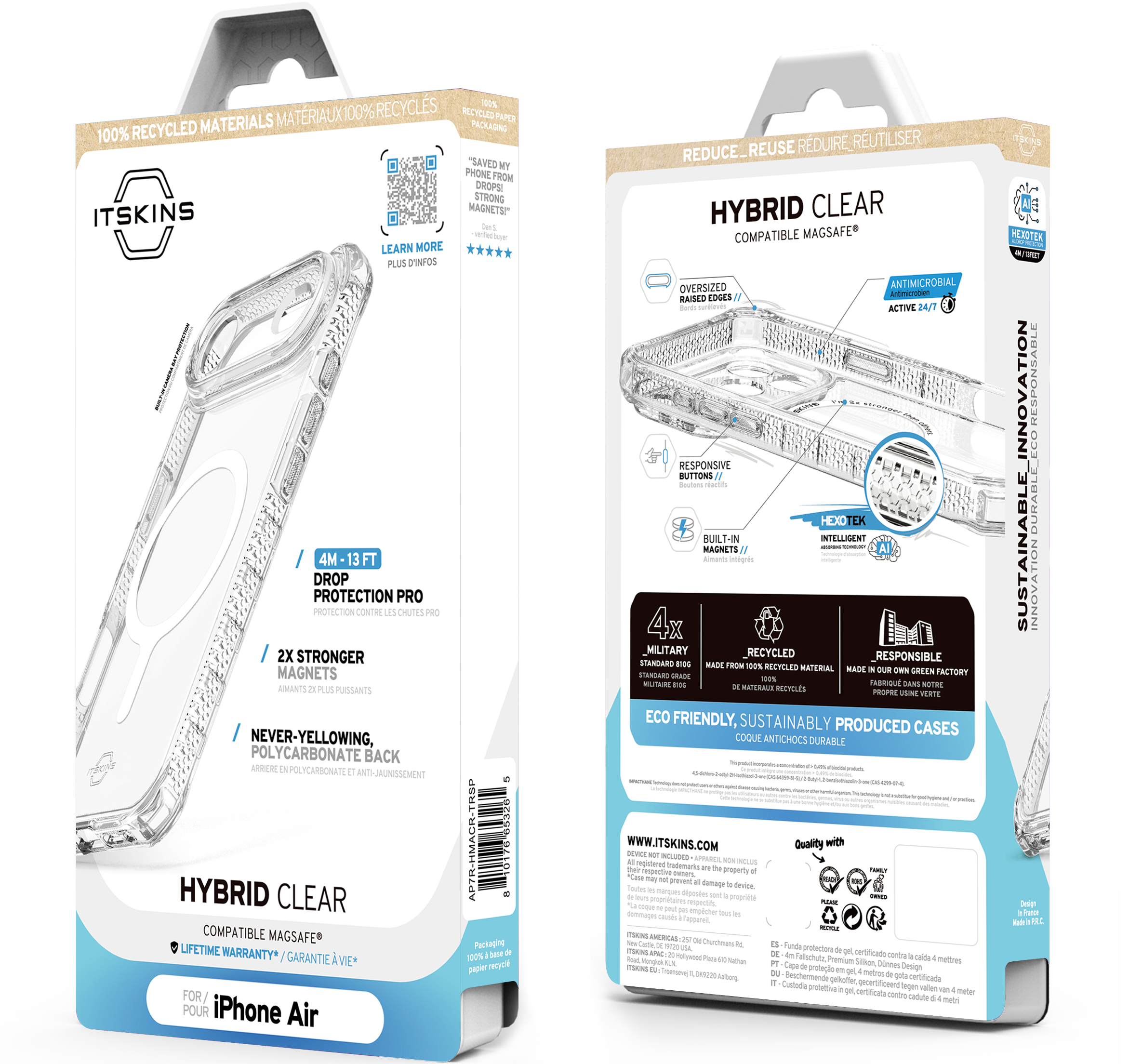 HYBRID_R CLEAR : Crafted for the Active, it features a never-yellowing, crystal-clear rigid polycarbonate back that showcases your phone's beautiful finish, 2X Stronger MagSafe and AI-Enhanced 3M / 10ft Drop Defense. It is Global Recycled Standard Certified, with an Eco-Friendly design incorporating Air-Pocket Corners, Antimicrobial Features, and Responsive Buttons. Comes with a Lifetime Warranty for Endless Adventures.