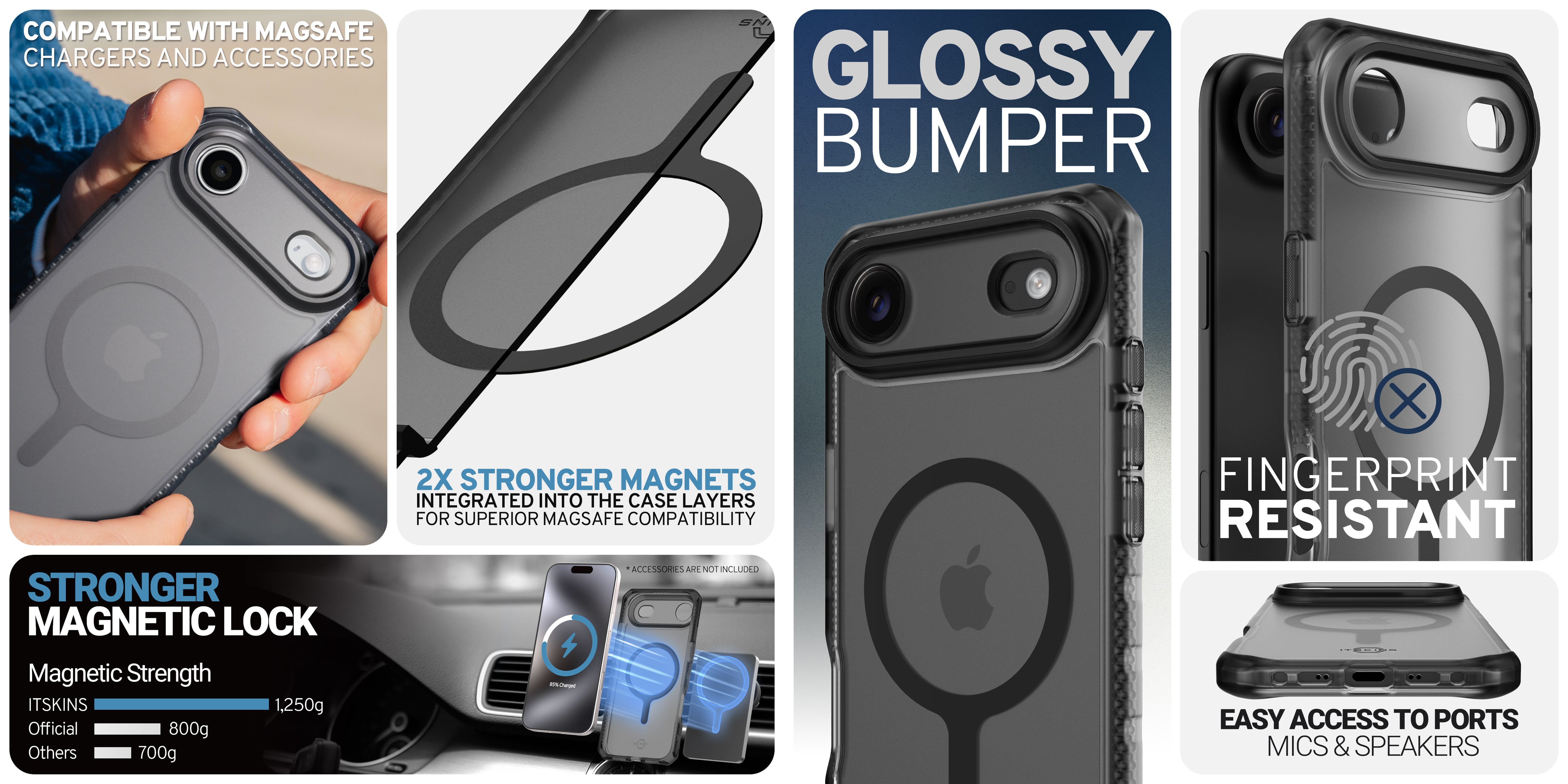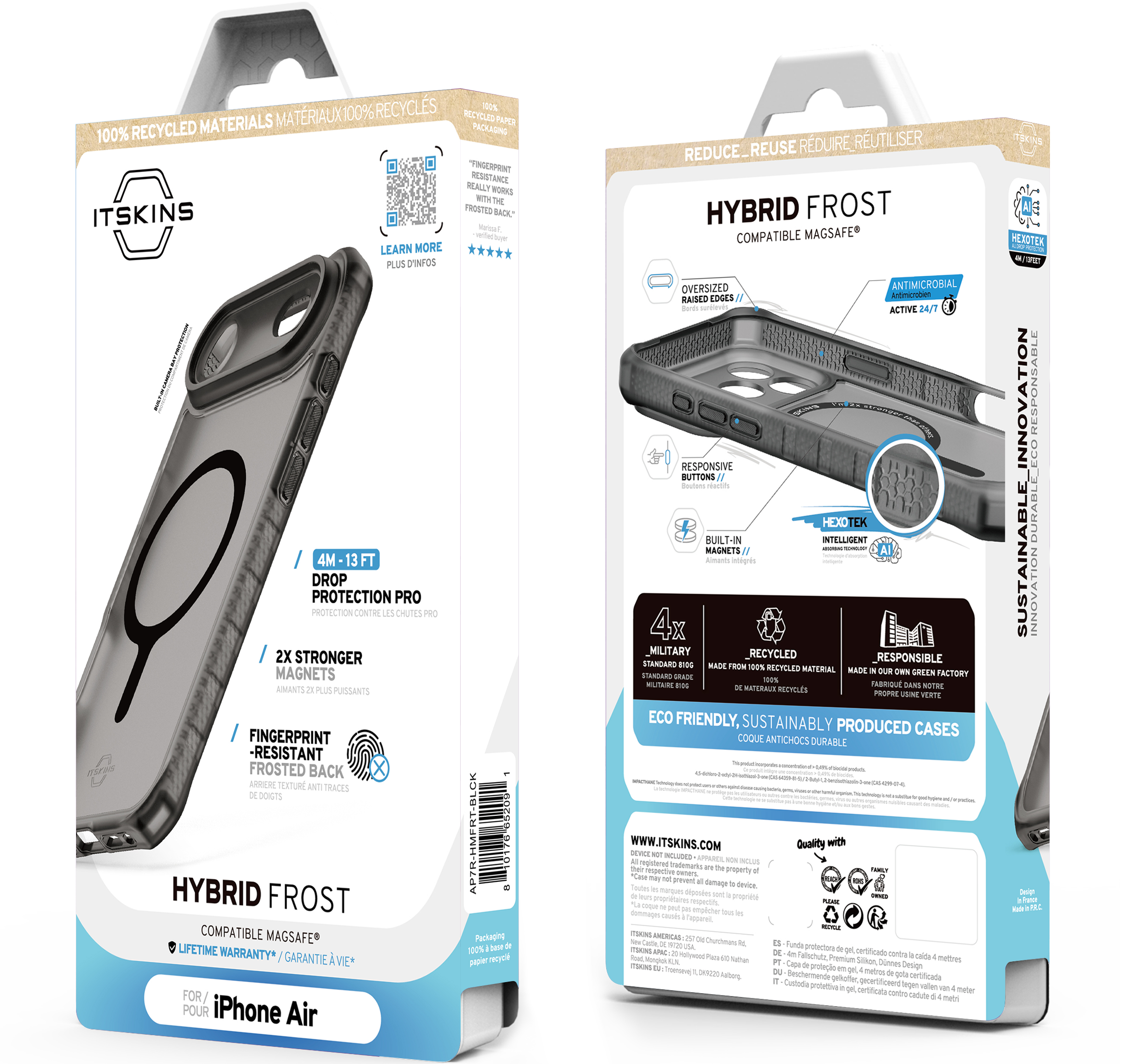 HYBRID_R FROST : features a beautiful, matte frosted finish with an anti-scratch surface so the integrity of the case stays intact., melded with 2X Stronger MagSafe, AI-Enhanced 3M / 10ft Drop Defense, and Stay-Clear Tech. Features a Solid Bumper, Eco-Conscious with Global Recycled Standard Certification, Air-Pocket Corners, Antimicrobial Protection, and Tactile Buttons. Adventure-Ready with a Lifetime Warranty.