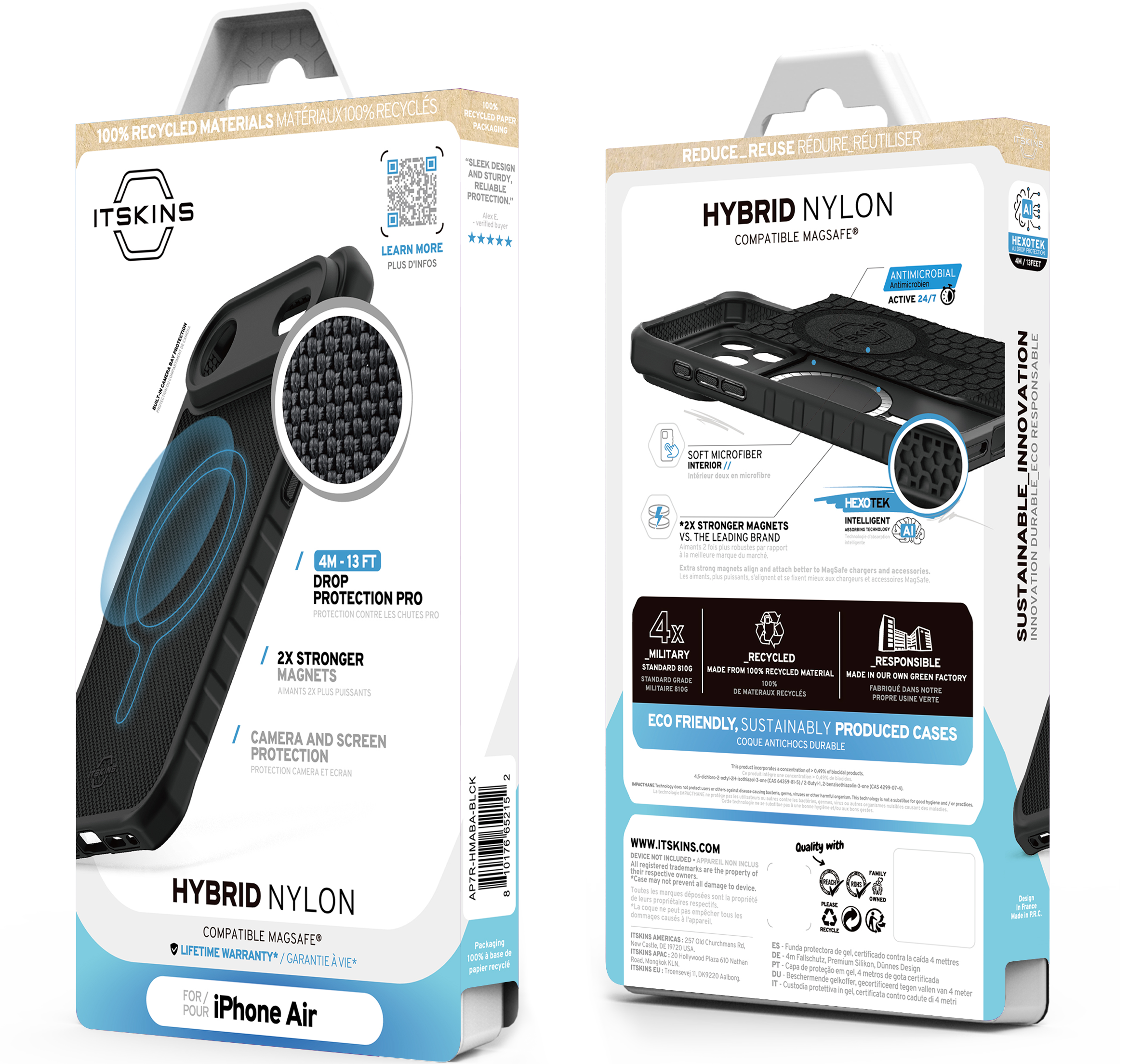 HYBRID_R NYLON : Combines a ballistic nylon weave back for rugged style and durability with a textured solid bumper for enhanced grip. It boasts a 2X Stronger MagSafe for secure attachment, is AI-enhanced to withstand drops up to 3m / 10ft, and is eco-friendly with Global Recycled Standard Certification. Includes features like air-pocket corners, antimicrobial protection, and responsive buttons, making it perfect for an active lifestyle, all supported by a lifetime warranty.