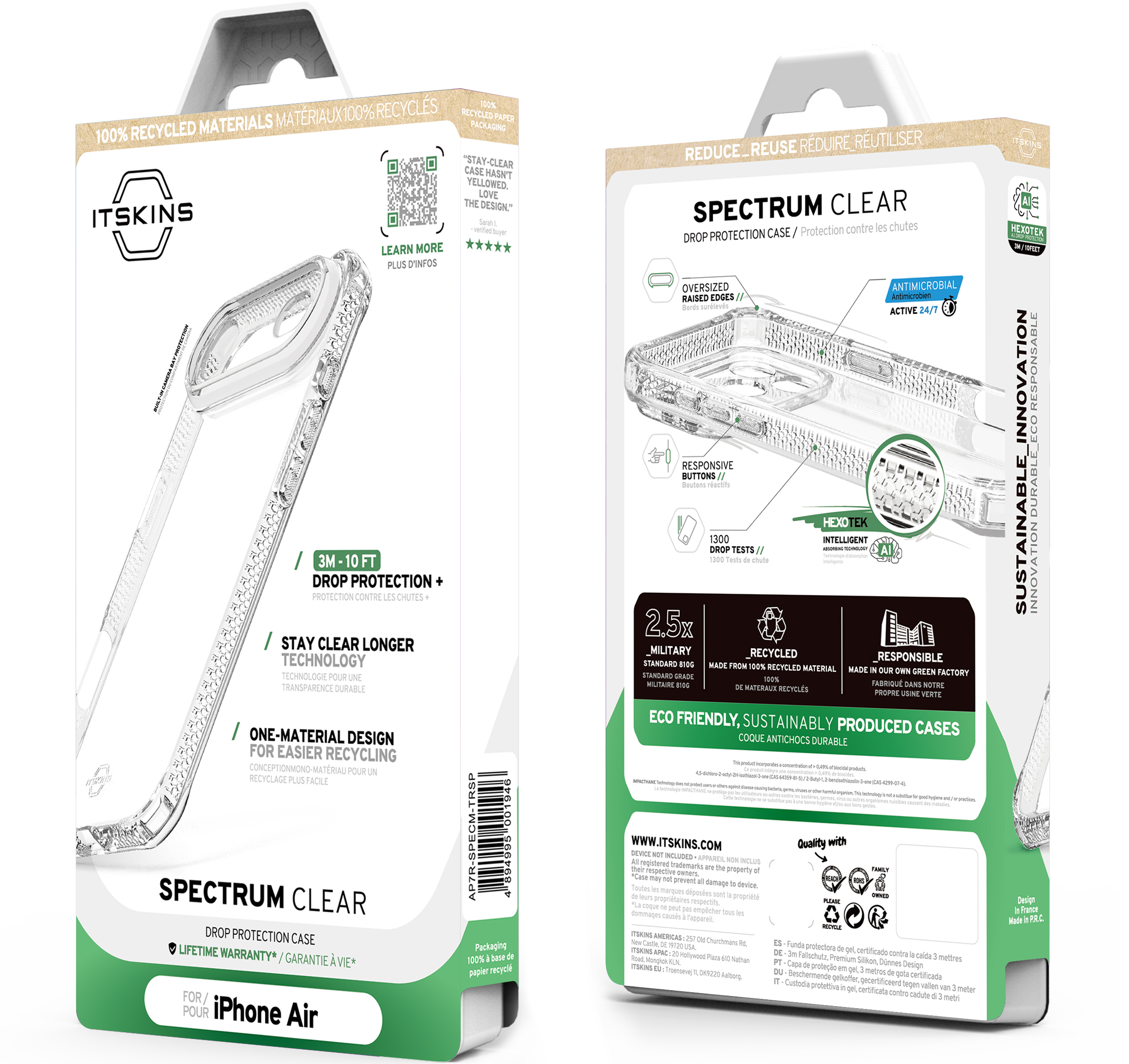 SPECTRUM_R CLEAR : Proprietary True Clear, Certified 100% Recycled, Mono-Material for Simplified Recycling. Offers AI-Enhanced Drop Protection up to 3M / 10FT, Superior Anti-Yellowing, and Antimicrobial Defense.