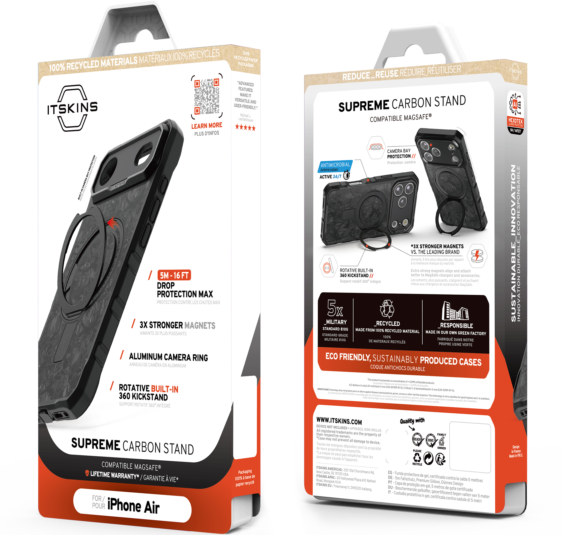 SUPREME R // STAND CARBON : is the ultimate case with numerous advanced features. It is loaded with extra strong magnets embedded around a folding MagSafe-compatible stand to hold to any metal surfaces. Enhanced with AI technology, it offers superior impact absorption around the interior perimeter, protecting your device from drops up to 4.5M / 15 Feet.
