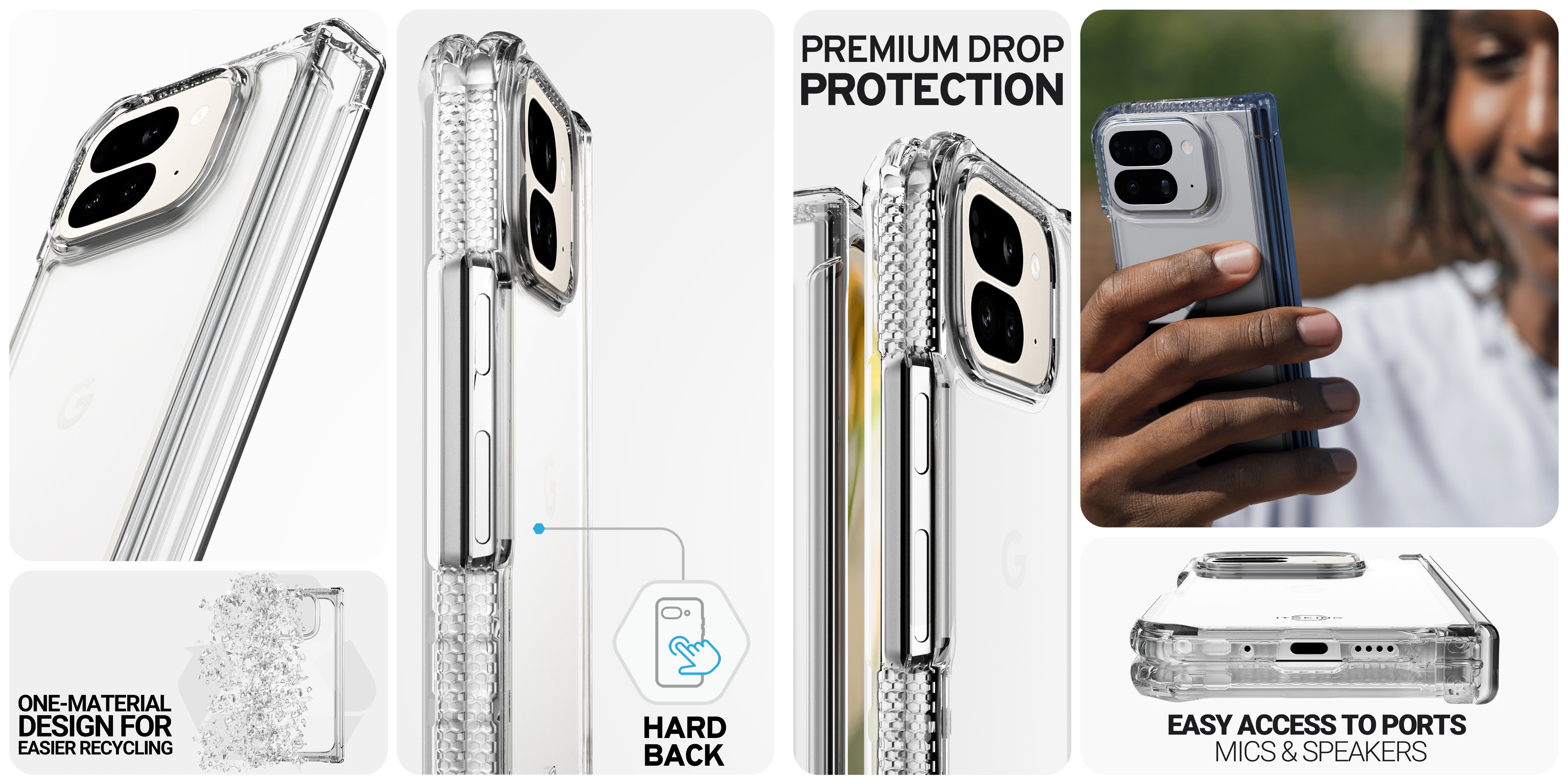 HYBRID_R CLEAR // HINGE Made from recycled materials; this slim, crystal-clear case lets you show off your phone’s premium design. It offers premium drop protection – up to 3M / 10 feet and ensures complete 360 protection of your device with a removable hinge feature. The hinge stays covered, and This also allows you to open and close your phone with either case stays in place with an innovative magnetic system.