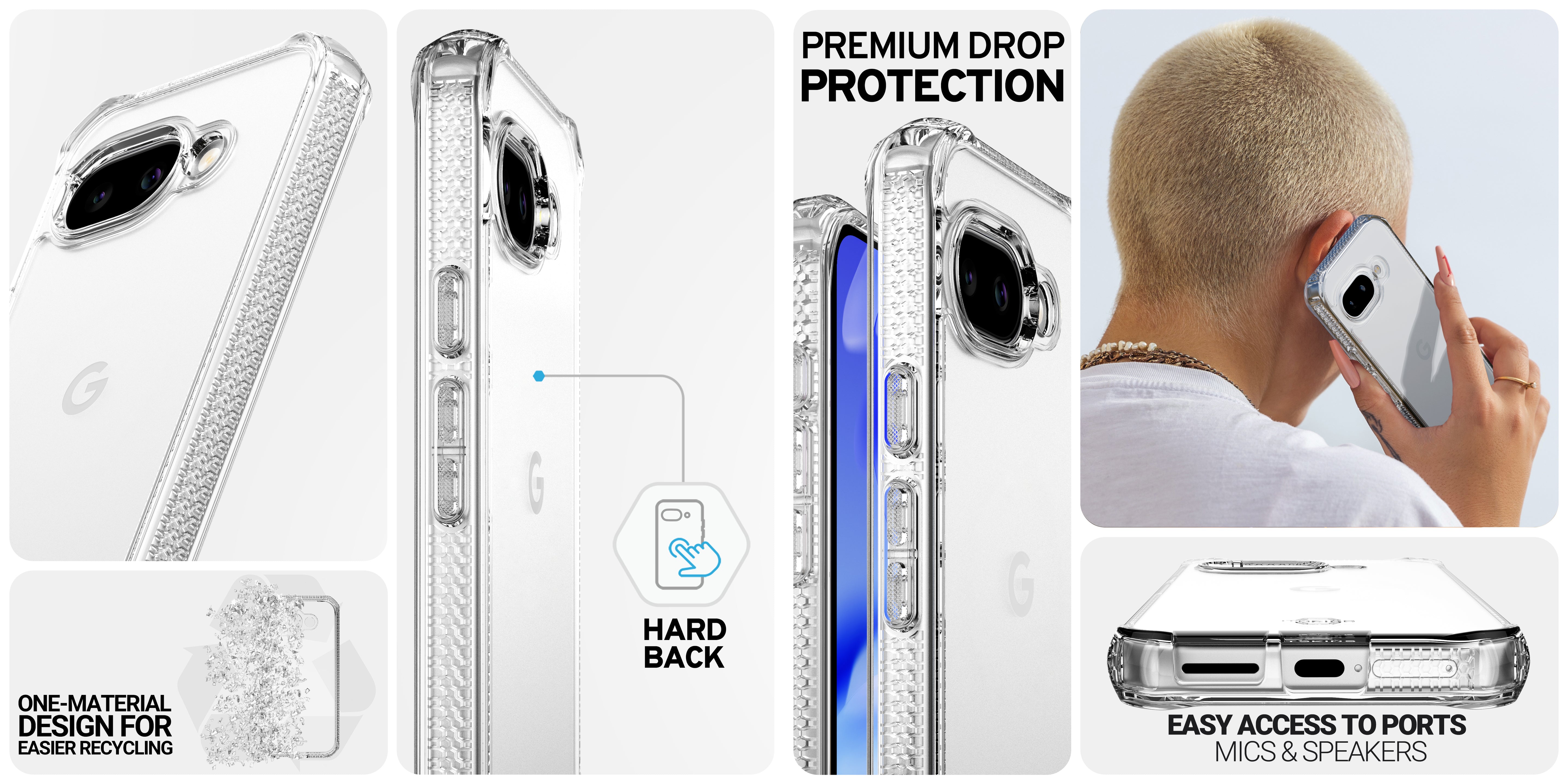 HYBRID R // CLEAR has been certified by the Global Recycled Standard for using 100% recyclable materials and produced with sustainable methods wherever possible. It delivers premium drop protection and anti-yellowing antimicrobial defense.
