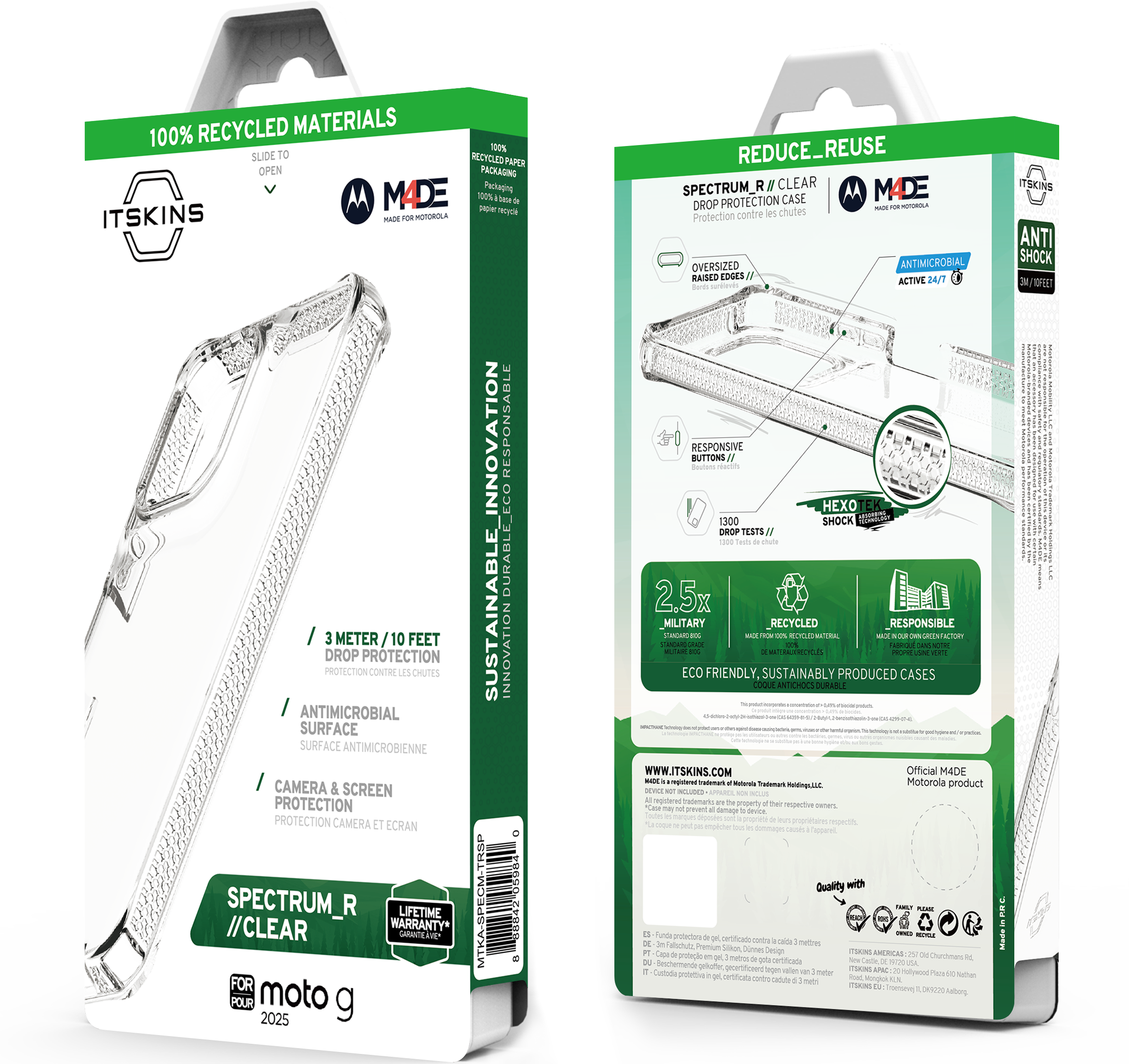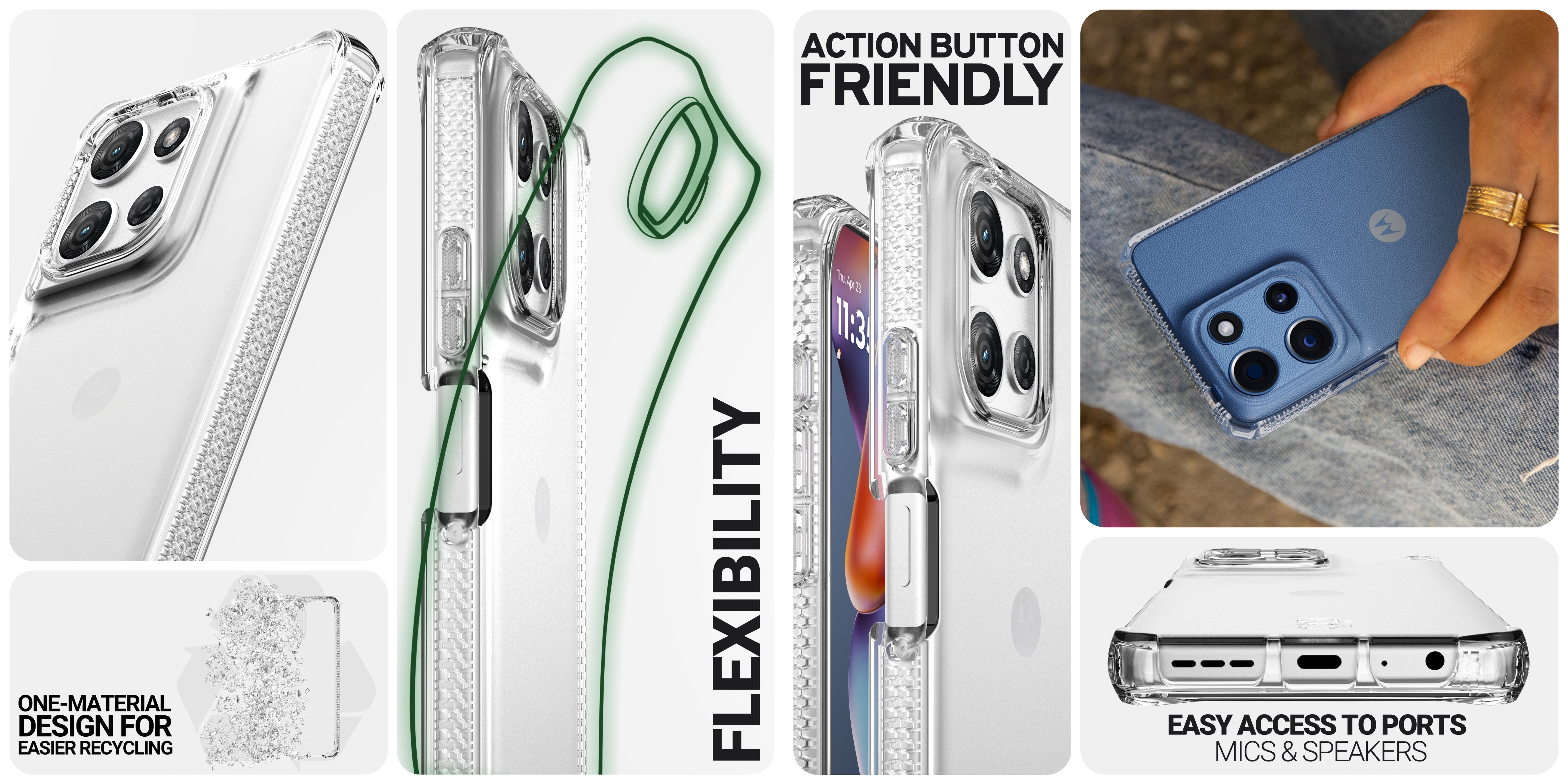 SPECTRUM_R CLEAR : Proprietary True Clear, Certified 100% Recycled, Mono-Material for Simplified Recycling. Offers AI-Enhanced Drop Protection up to 3M/10FT, Superior Anti-Yellowing, and Antimicrobial Defense.