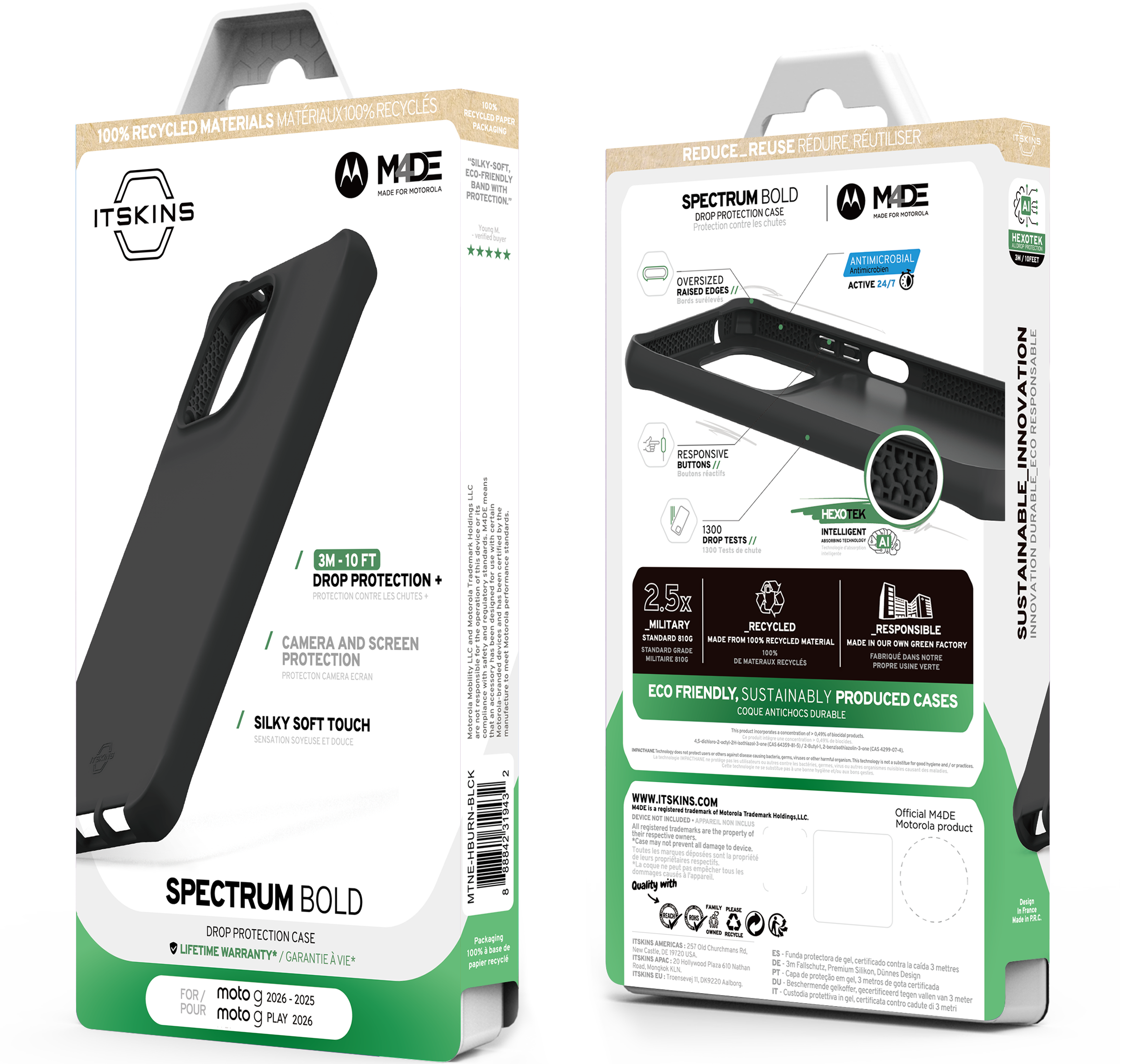SPECTRUM_R // BOLD has a silky-soft feel and has been certified by the Global Recycled Standard for using 100% recyclable materials and produced with sustainably. It delivers premium drop protection and antimicrobial defense.