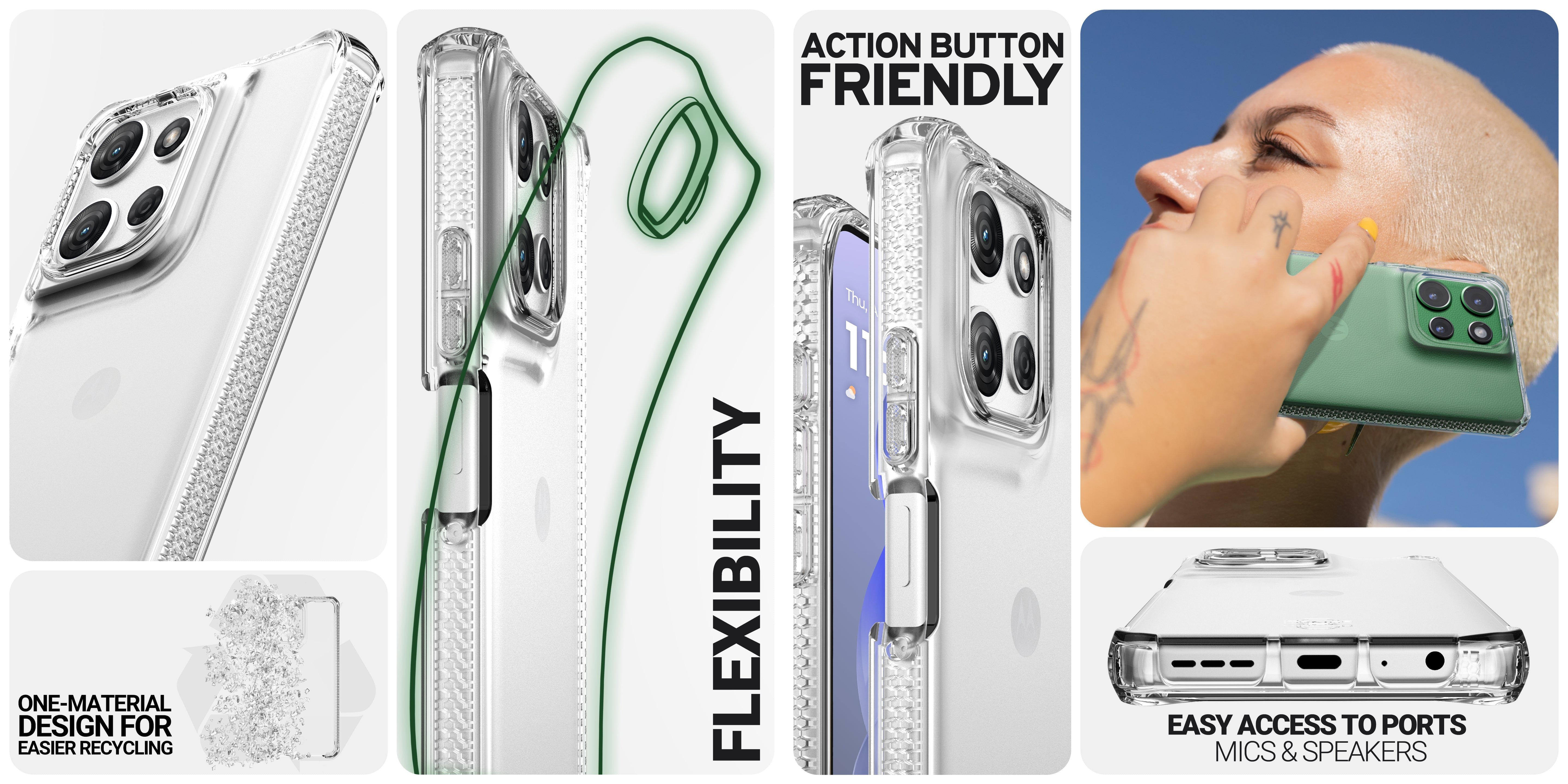 SPECTRUM_R CLEAR : Proprietary True Clear, Certified 100% Recycled, Mono-Material for Simplified Recycling. Offers AI-Enhanced Drop Protection up to 3M/10FT, Superior Anti-Yellowing, and Antimicrobial Defense.