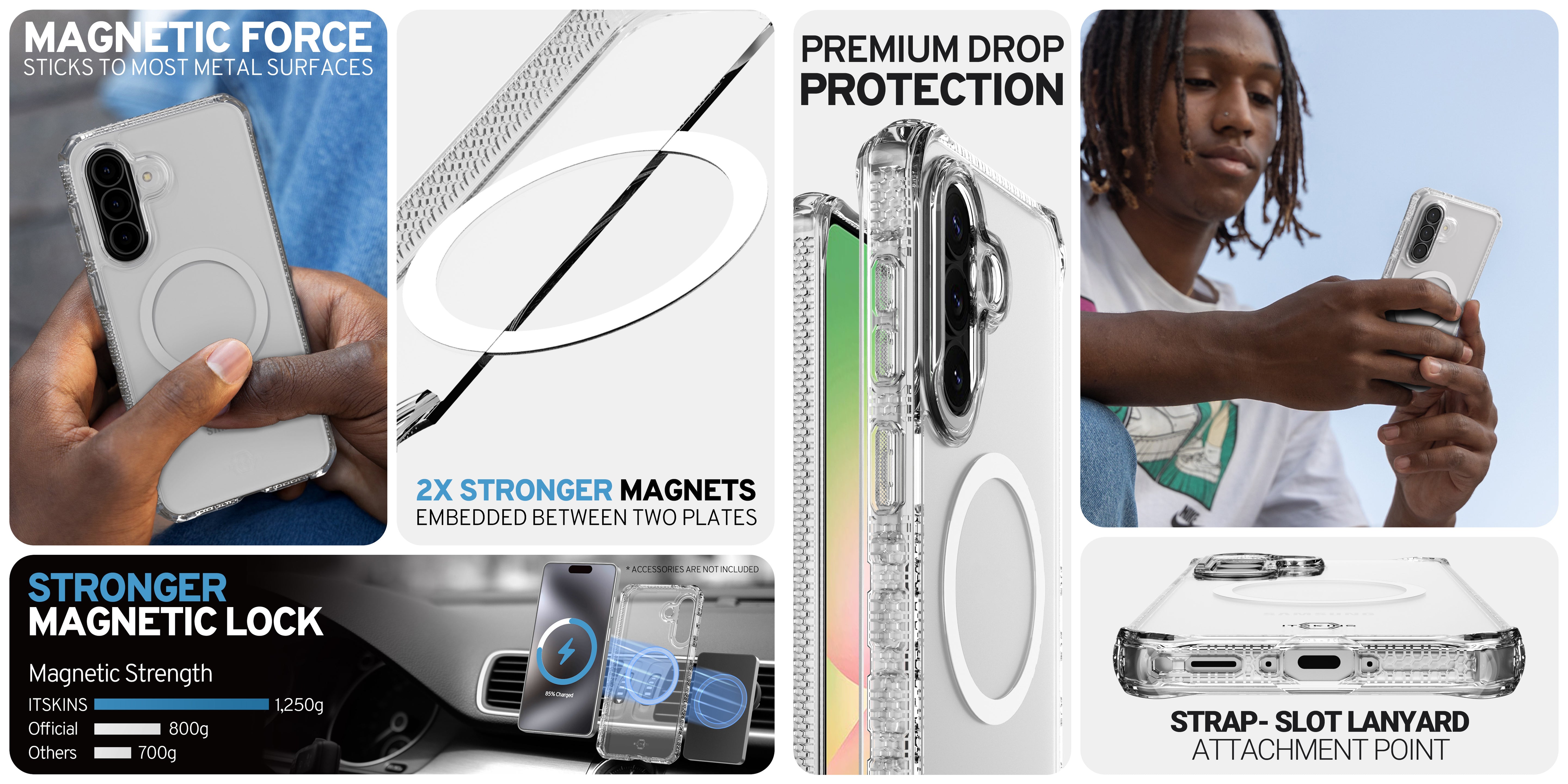 HYBRID_R CLEAR : Crafted for the Active, it features a never-yellowing, crystal-clear rigid polycarbonate back that showcases your phone's beautiful finish, 2X Stronger MagSafe and AI-Enhanced 4M / 13FT Drop Defense. It is Global Recycled Standard Certified, with an Eco-Friendly design incorporating Air-Pocket Corners, Antimicrobial Features, and Responsive Buttons. Comes with a Lifetime Warranty for Endless Adventures.